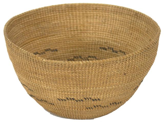 Circa 1930, Rare woven basketry bowl with flared sides and simple bird design; very good condition. 3-5/8" x 7-1/4"
