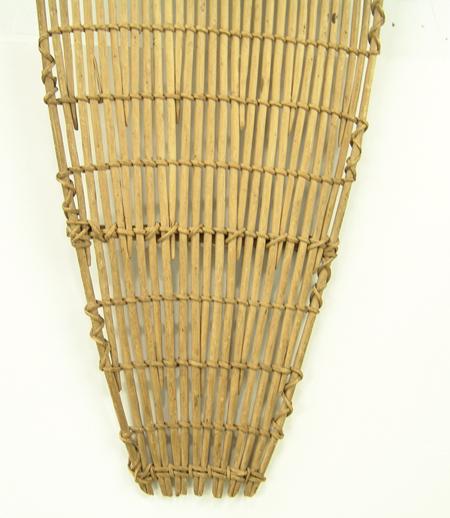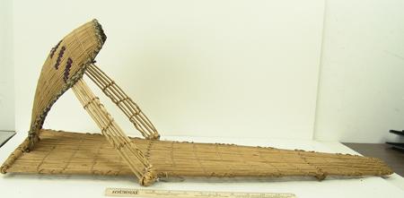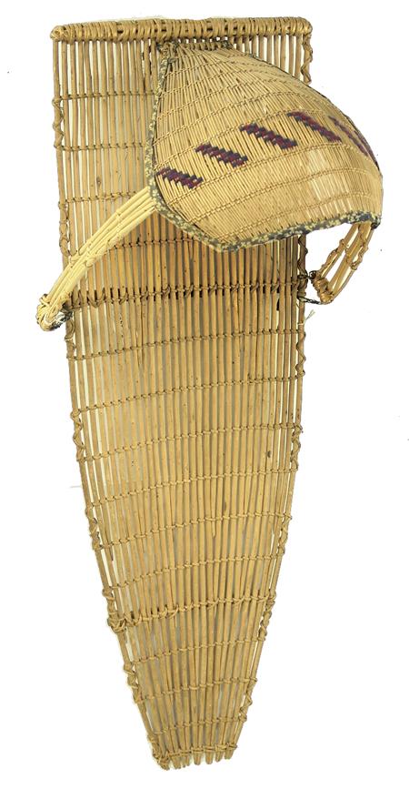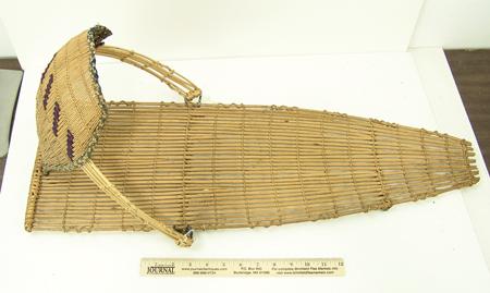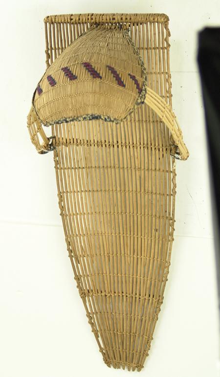 Circa Early 1900s, Classic full-sized woven basketry cradleboard with incorporated sunshade decorated with yarns and trimmed with calico cloth. Very good condition. 29-1/2" x 10" x 10" From the Johnson Collection.