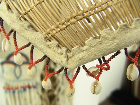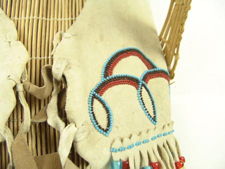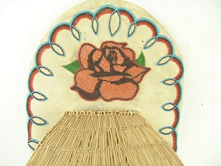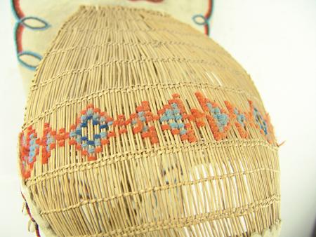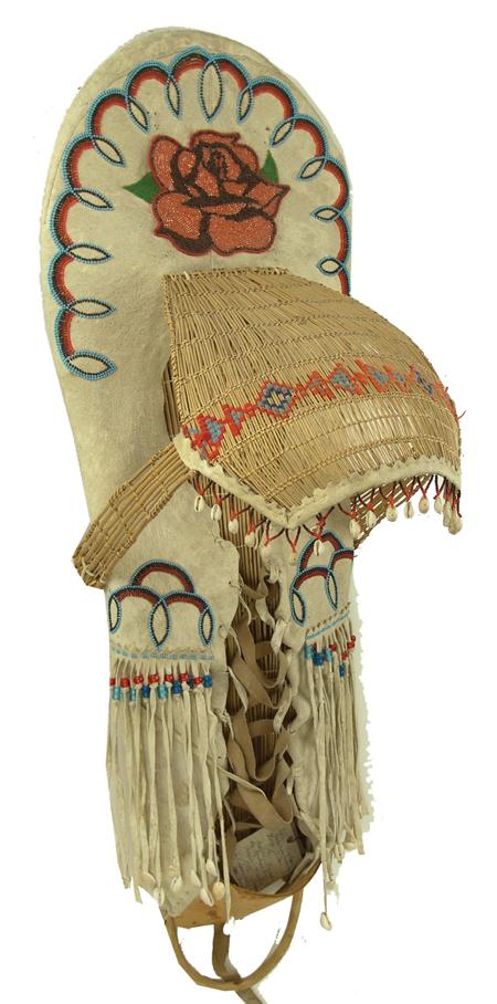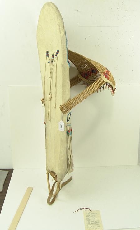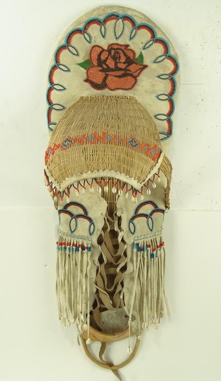 Circa 1960s, Beautiful full-sized bentwood and willow frame covered with buckskin and with beautiful beaded designs with basketry sunshade. Very good condition. 38" x 13" x 13" From the Johnson Collection.