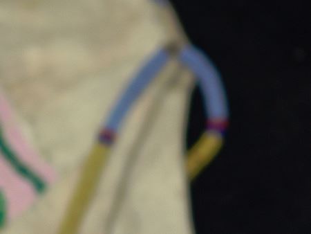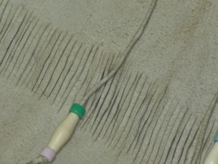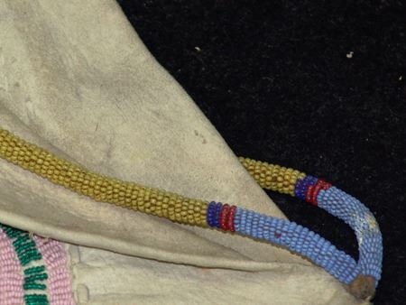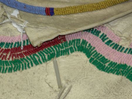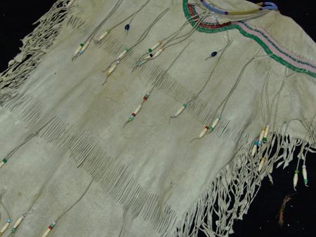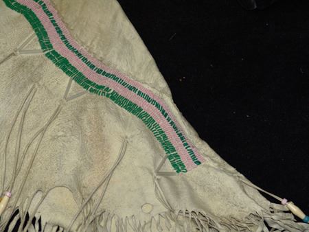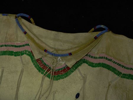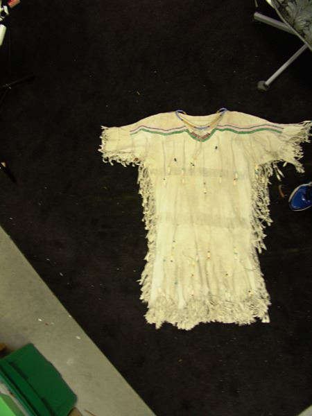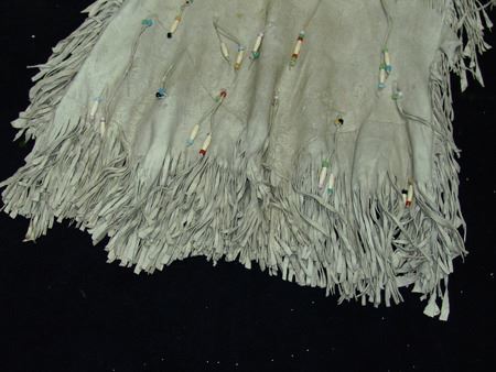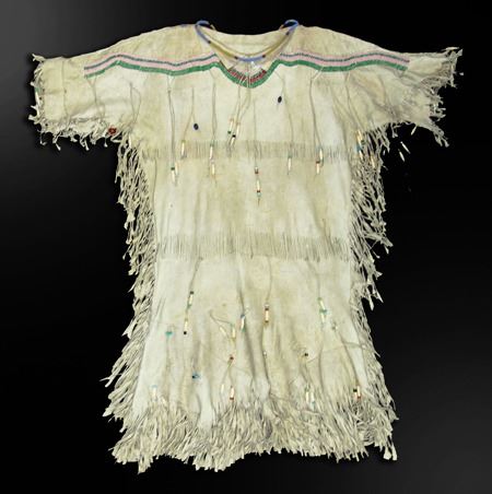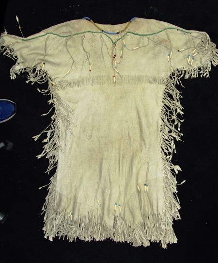 Ca. 1940s, Very nice two-hide brain tanned white buckskin dress with traditional sinew sewn and lazy stitch beaded contour yoke, beaded rope neck band and cut-in fringe, and with an interesting waist made in open work fringe style. Very good condition, minor bead loss. Large/Extra Large