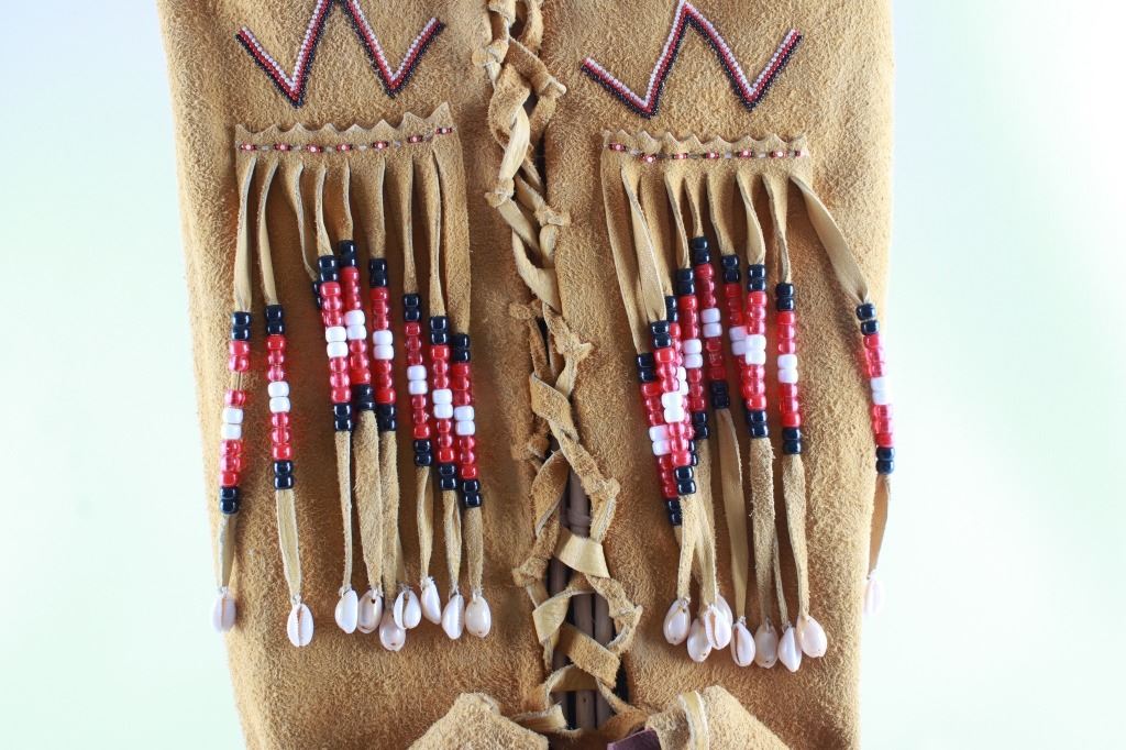 This is a beautiful full size Basketry Cradle Board from Paiute / Modoc Native American artist, Leda Wyatt dating to the circa 1980's. The large, full size cradle board, also referred to as a cradleboard or papoose, shows a willow woven frame and basketry visor. The body of the cradle board is covered in tanned hide leather with nice yellow color and adorned with classic geometric beadwork as well as beaded fringes in metal, glass and resin beads as well as conch shells, number three wampum. The basket visor is woven with blue yarn, lined with tanned hide leather trimmings that is adorned with seed bead, a fancy beaded edge adn conch shells. 41”L The back has fringes with beads as well. The piece is well kept in good condition. Measures overall 41.5"L by 15.75"W by 14.5"D.