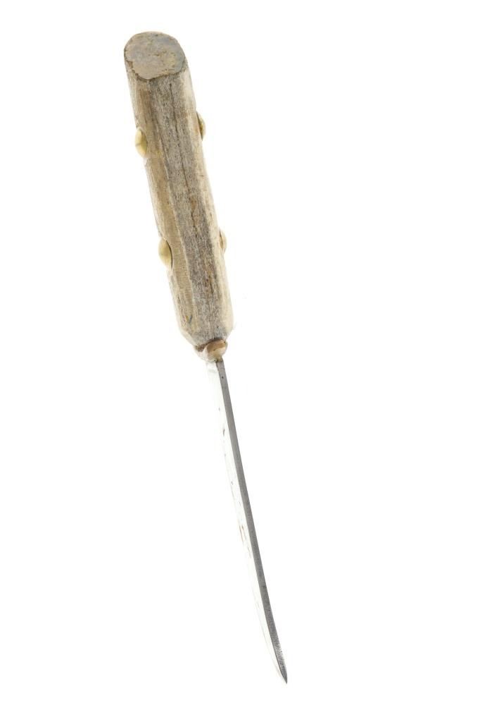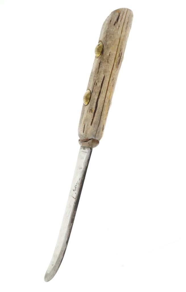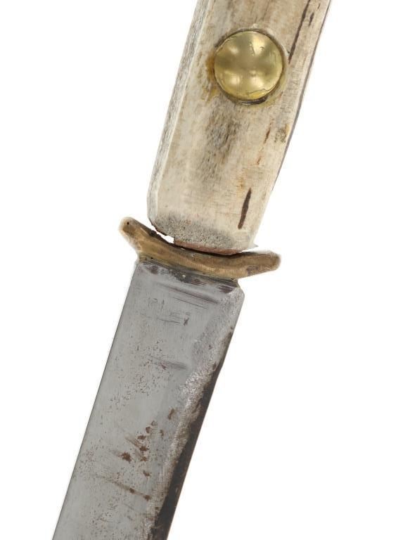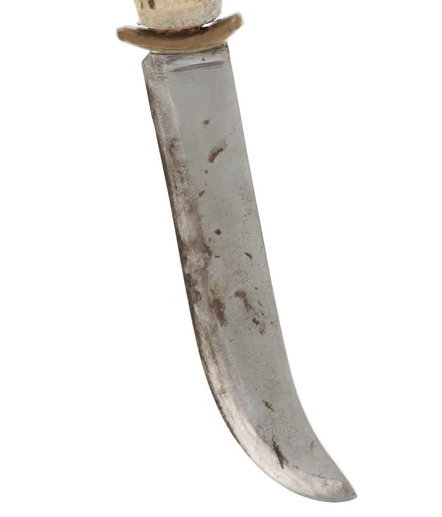 The lot features a Paiute Modoc large knife with hidden tang Elk Antler handle with large brass tacks or studs on either side. The blade has a hooked tip and a thick, what appears to be a carbon steel blade with brass hilt. This handmade knife has a vintage age and is well kept. Measures overall 12.25"L.