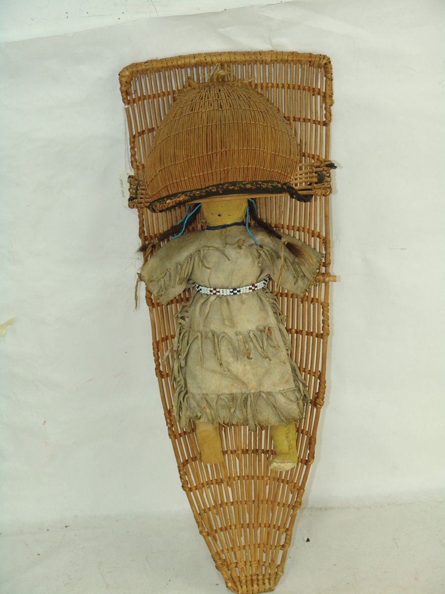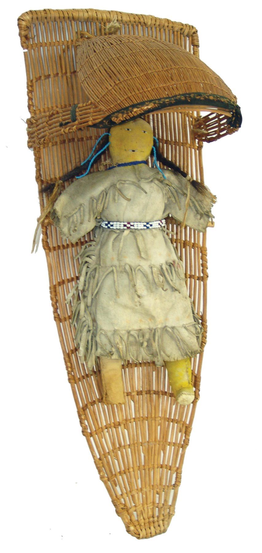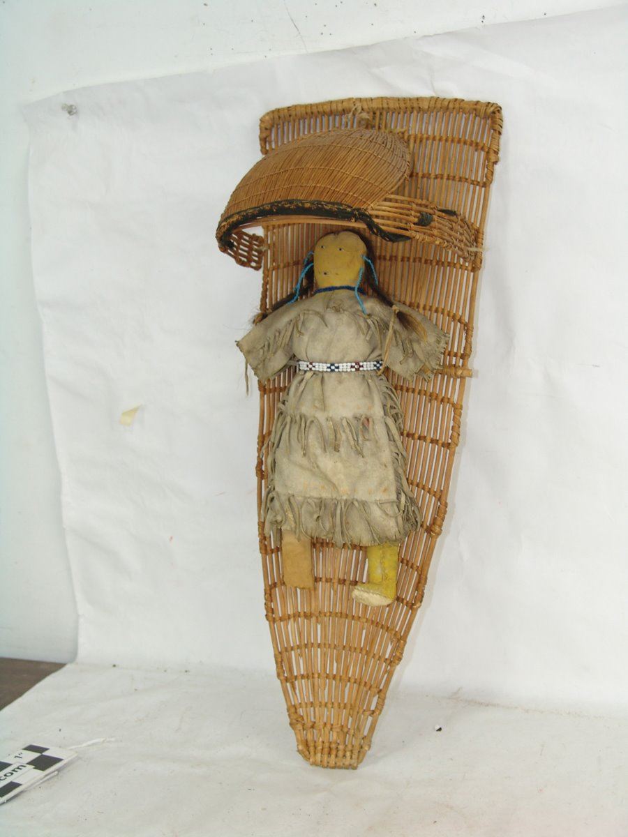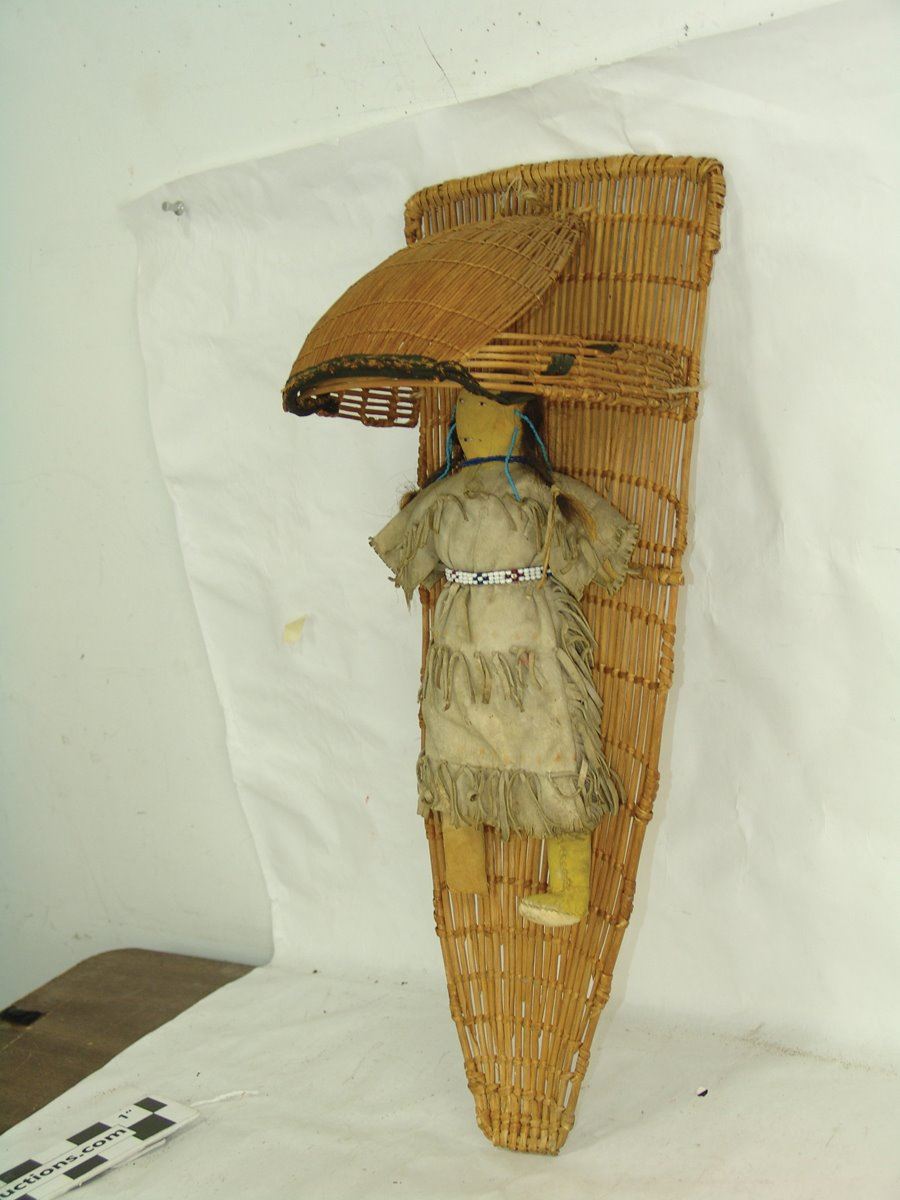 Classic early 1900s woven basketry baby carrier with traditional sunshade, plus a hand crafted buckskin doll from the mid 1900s that is intact but missing one foot. Good condition.,Early/Mid 1900s,23"