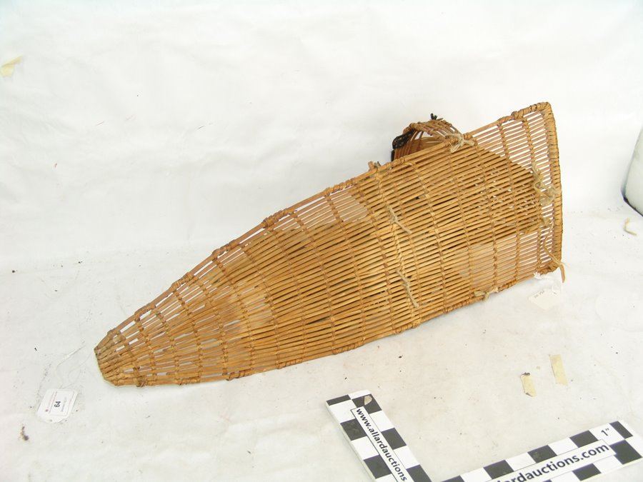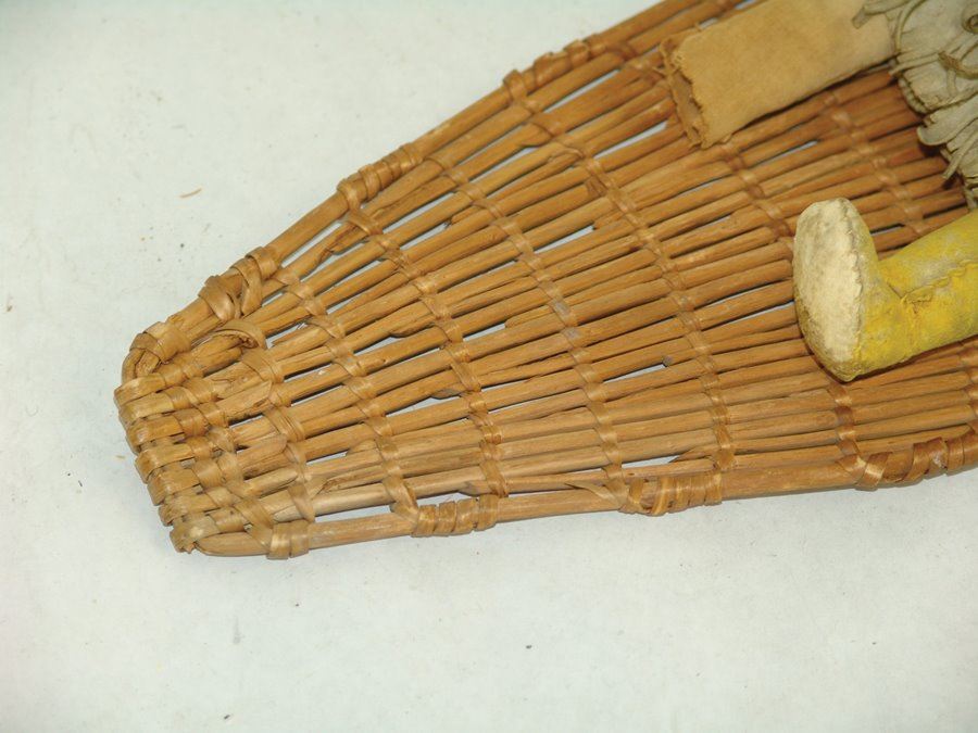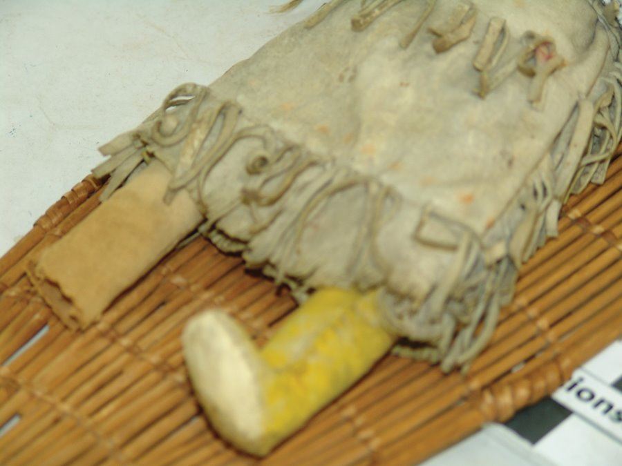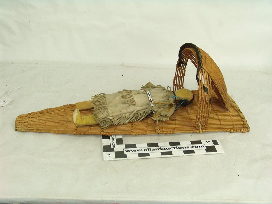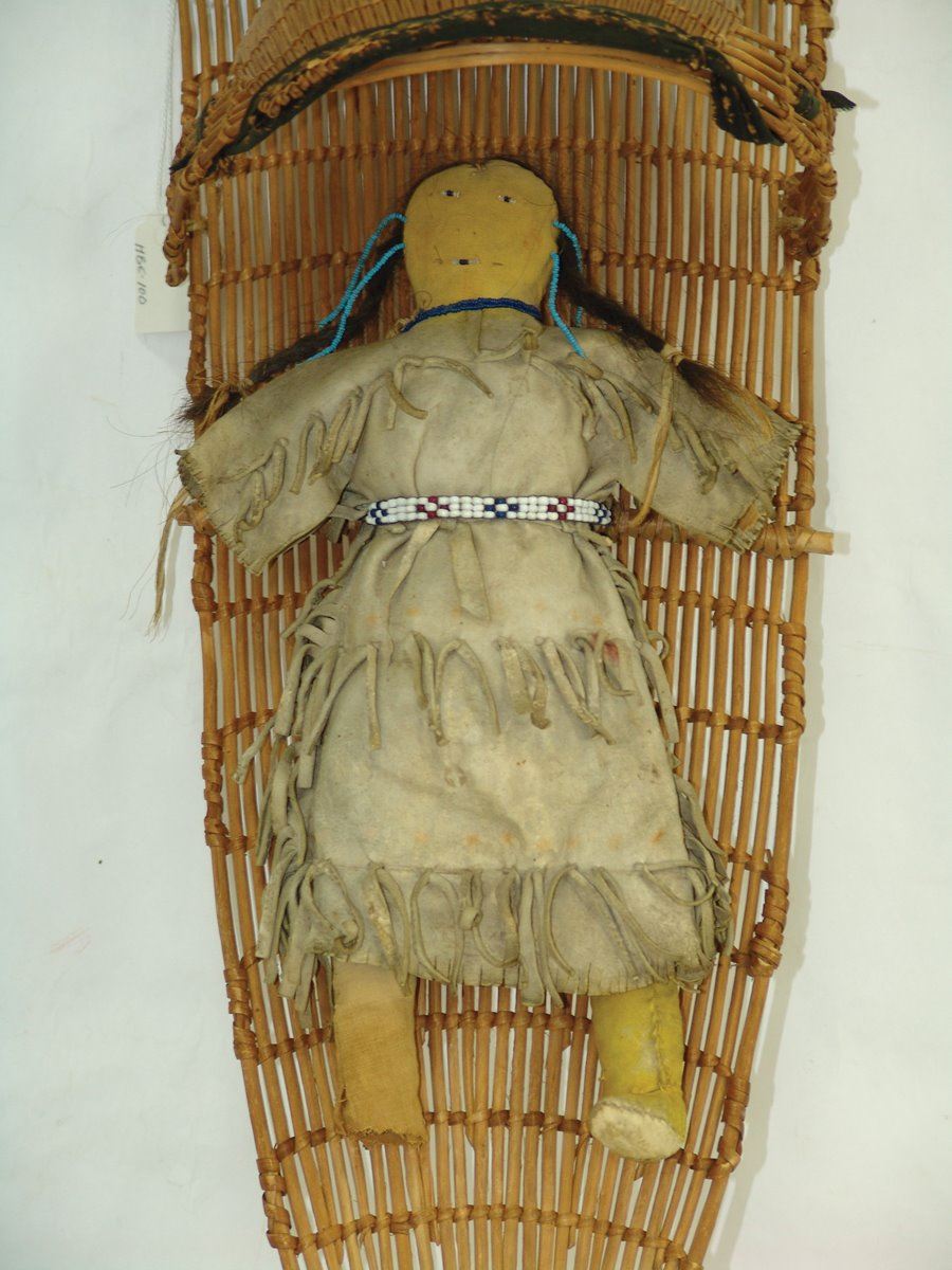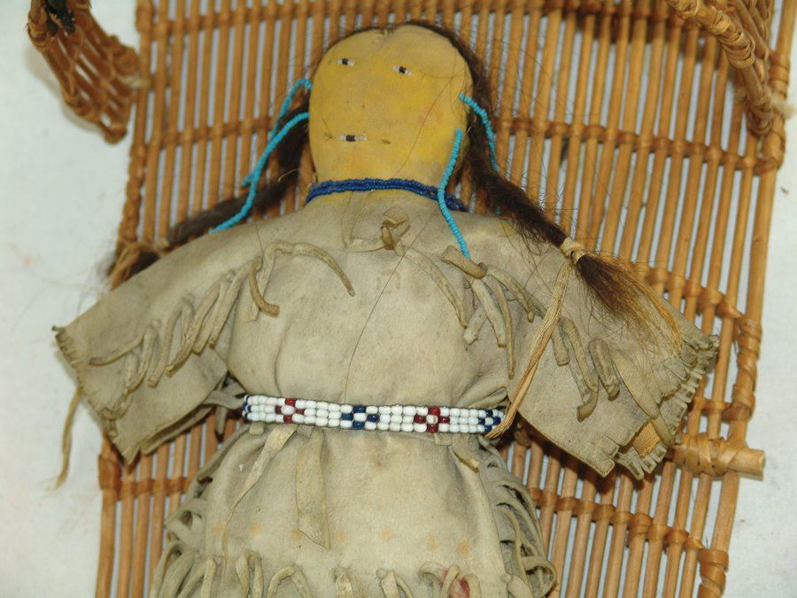 Classic early 1900s woven basketry baby carrier with traditional sunshade, plus a hand crafted buckskin doll from the mid 1900s that is intact but missing one foot. Good condition.,Early/Mid 1900s,23"