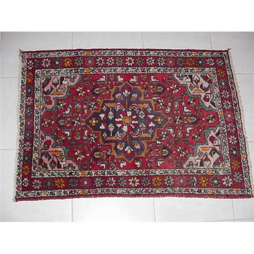 59'' X 41'' Wool carpet, red center field surrounded by flower border. Very good condition.