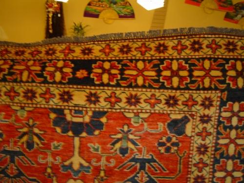 Rug Facts. Size: 4' 2.5" X 6' 3.5", Country of Origin: Pakistan, Style: Tribal Pattern, Age: New, Condition: Excellent, Color: Hand dyed, Vegetable Colors, Red & Navy on a Cream background with med. Blue and med. Green accent colors, Techinque: Hand Knotted - 150 knot per square inch, Pile: 100% Wool - Short, Foundation: 100% Wool, Value: $1,200.00.  The fineness and quality of each rug is determined by factors such as the number of knots per square foot, (knot density). As the knot density increases, more intricate designs and greater detail can be achieved. Also, the more knots per square foot there are, the shorter the pile yarn can be cut. Hence, the highest quality rugs are those with fine patterns and thin piles.