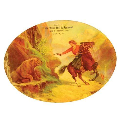 The Palace Hotel and Restaurant Sign, Galva, IA.. Glass chain hanger. Cowgirl on a horse shooting a bear. Slight lifting around edges, otherwise excellent condition. 7 3/4 X 5 3/4 inches.