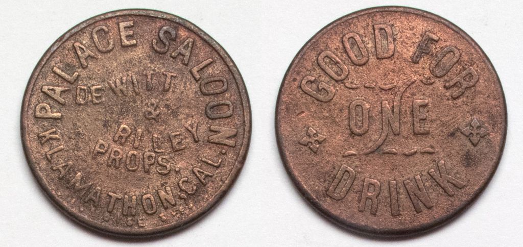 This is a GOOD FOR ONE DRINK brass token from The Palace Saloon in Klamathon, CA. This token is in very good condition and unlisted.City: KlamathonCounty: Siskiyou State: CADate: