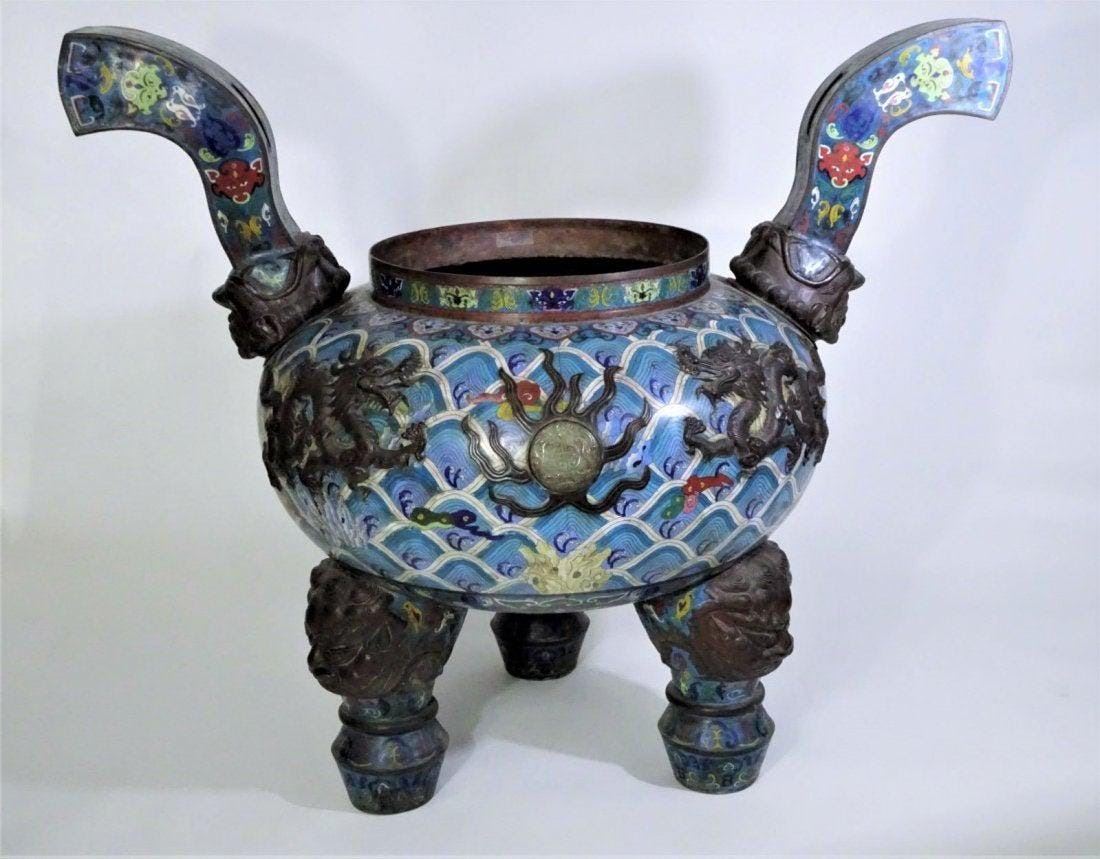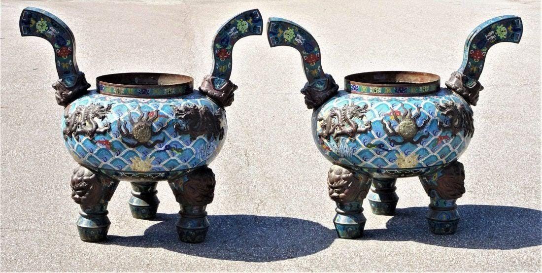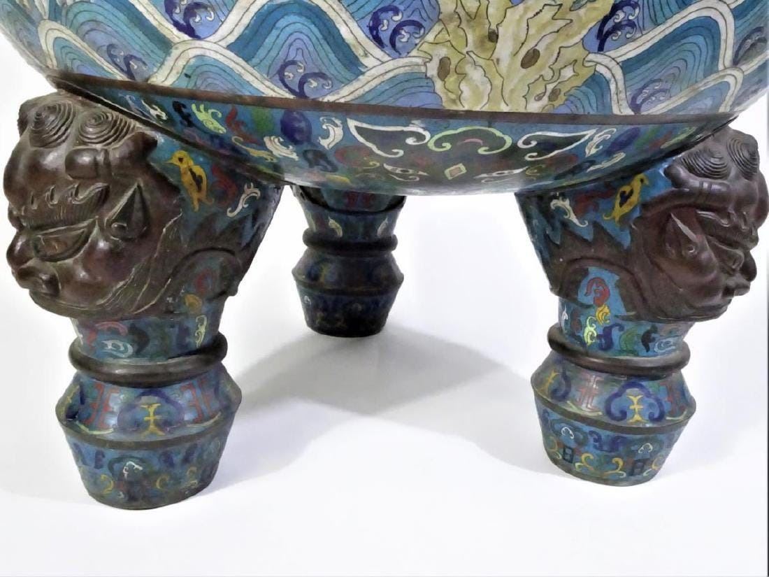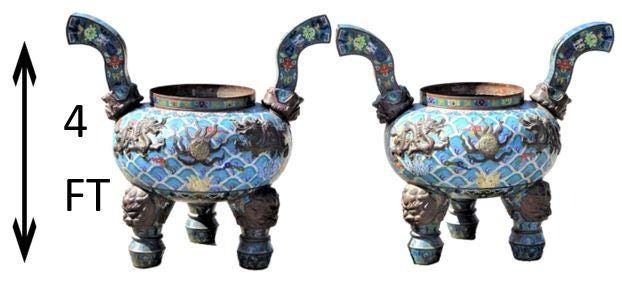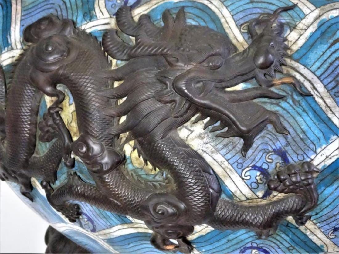 Height: 4 ft. Diameter: 3 1/4 ft. Depicting a dragon amidst waves chasing a flaming pearl with foo dog legs.