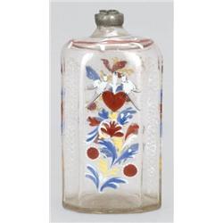 Ausztria, 18. sz. közepe, színtelen hutaüveg, zománcfestett díszítéssel, ón kupakja sérült, m: 14,5 cm, ón kupakja sérült