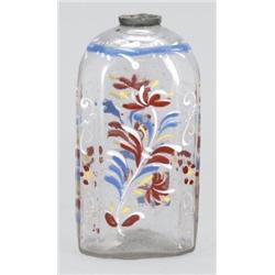 Ausztria, 18. sz. közepe, színtelen hutaüveg, zománcfestett díszítéssel, ón kupakja sérült, m: 14 cm, ón kupakja sérült
