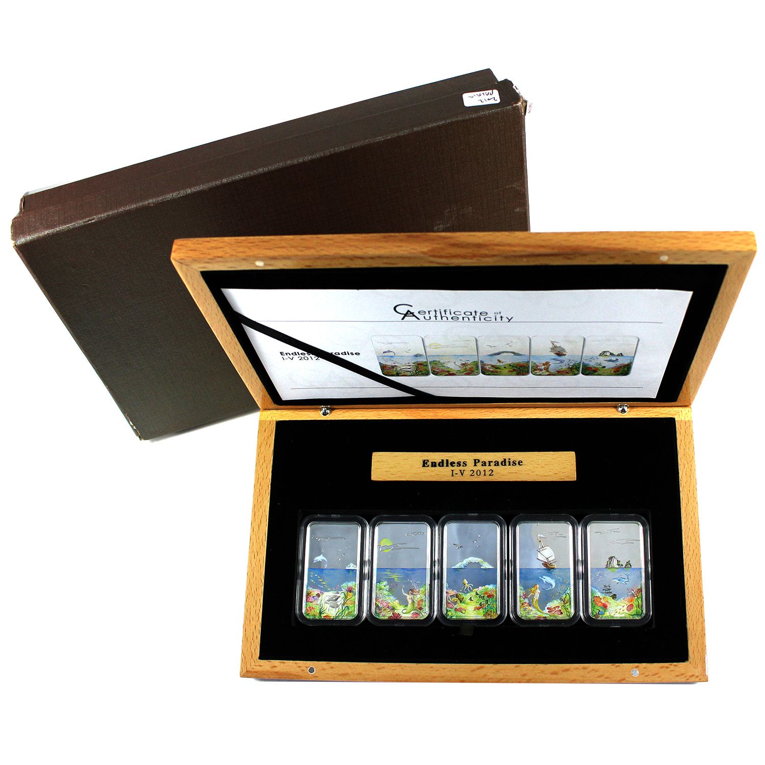 Beautiful Design! The five coins combine to form a unique complete picture regardless of how they are placed beside each other. Limited to 888 Sets Minted! Scratched capsules; wear and tear to outer beauty box