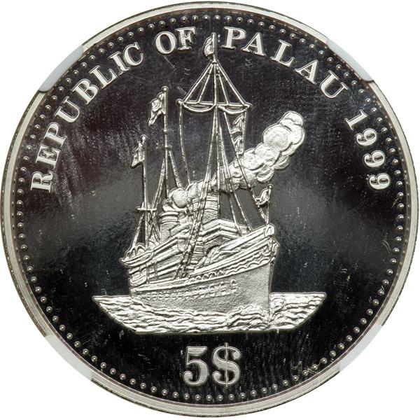 Palau. 5 Dollars struck in Palladium, 1999. Design of KM-21. Weight One Ounce. German New Guinea. Reverse: Imperial yacht, Hohenzollern. Only 7 Pieces struck in palladium. Extremely Rare. NGC graded Proof 69 Ultra Cameo.
