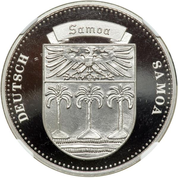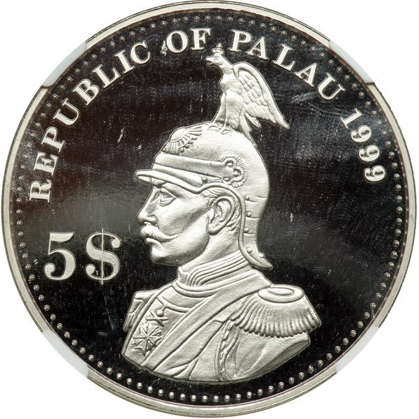 Palau. 5 Dollars struck in Palladium, 1999. Design of KM-22. Weight One Ounce. German Samoa. Reverse: Wilhelm II. Only 7 Pieces struck in palladium. Extremely Rare. NGC graded Proof 69 Ultra Cameo.