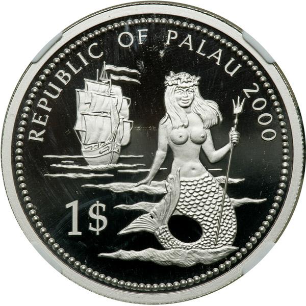 Palau. Palladium Essai 1 Dollar, 2000. Obverse design as KM-43. Weight one ounce. Topless mermaid and sailing ship. Reverse: ESSAI / 1 Oz .999. Only 15 pieces struck in palladium. Rare. NGC graded Proof 68 Ultra Cameo.
