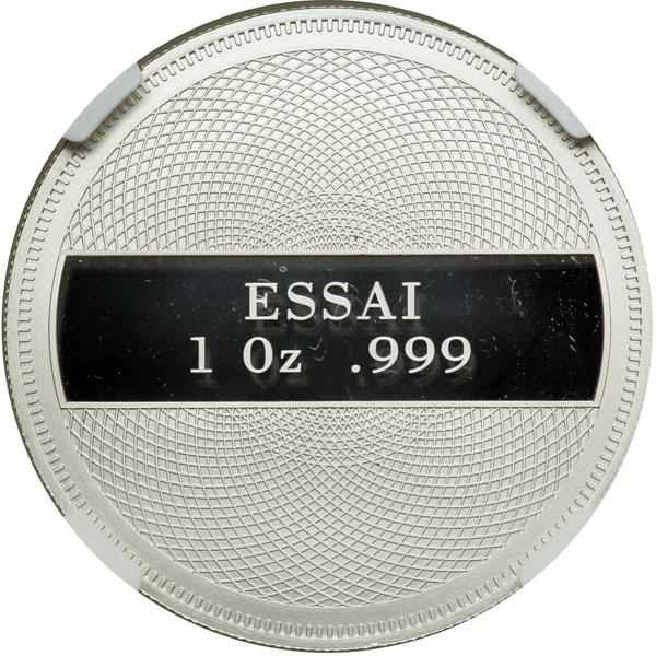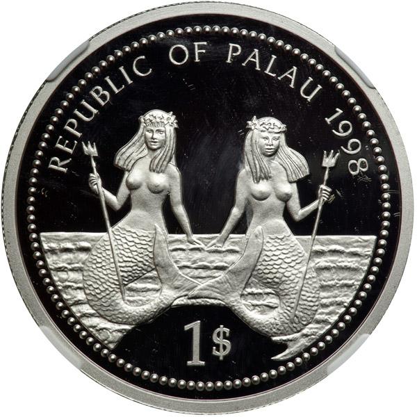 Palau. Platinum Essai One Dollar, 1998. Obverse design as KM-25. Weight One Ounce of Platinum. Two topless mermaids. Reverse: ESSAI / 1 Oz .999. Only 5 pieces struck in platinum. Extremely Rare. NGC graded Proof 69 Ultra Cameo.