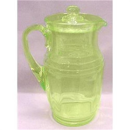 Produced during the 1920s-1930s from glowing pale green Vaseline Depression glass. Features a panel optic design, applied handle, and has a lid. Measuring 10 1/2 inches tall to the top of the finial x 4 3/4 inches across the lid with bother pitcher and lid in excellent condition.