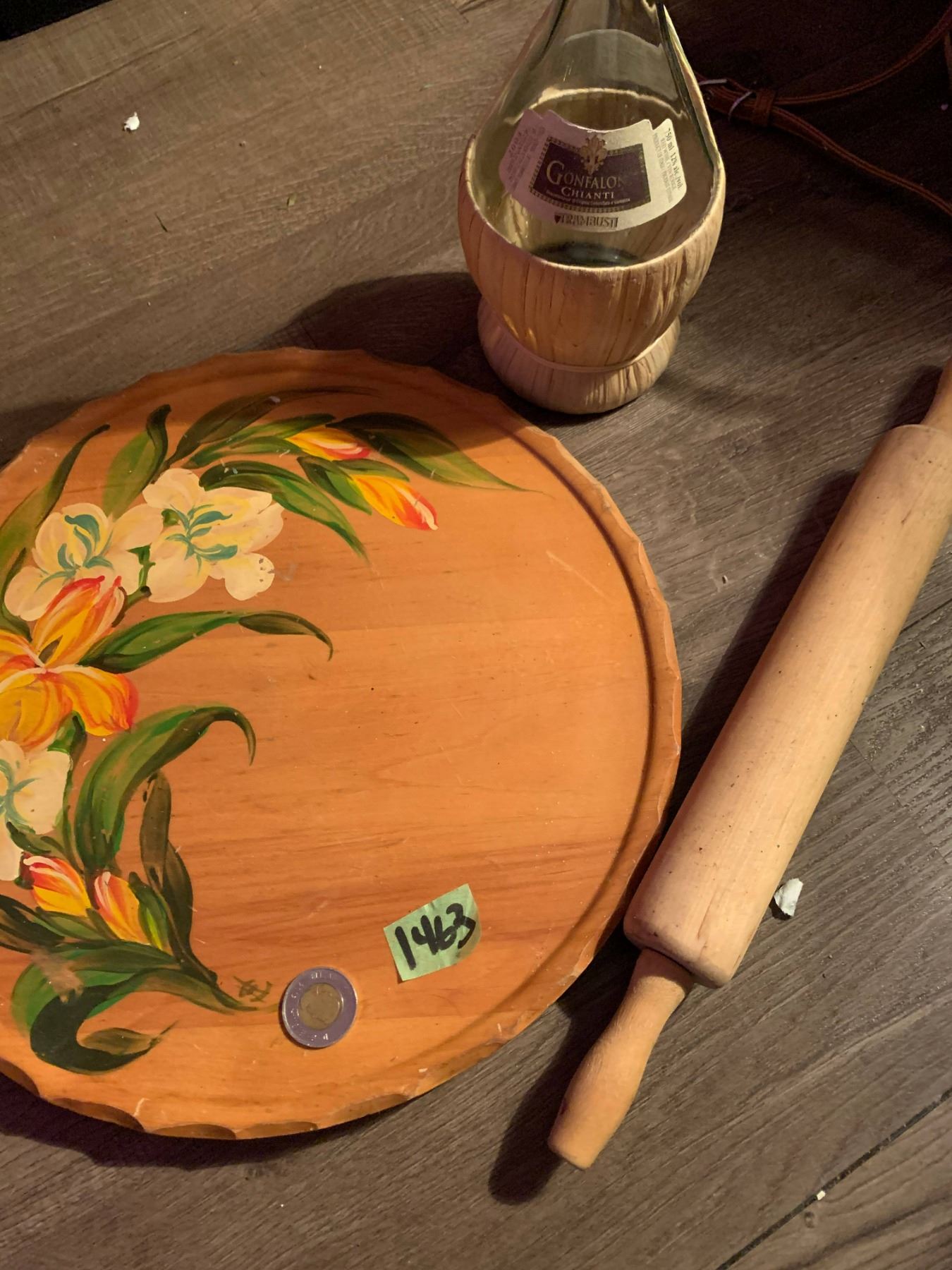Pale wood scandi design platter, rolling pin, covered wine bottle