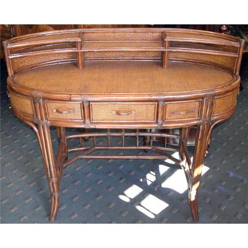 This pretty desk of pole and woven rattan with leather strapping was made by Palecek. Features 2 unique 1/2 moon drawers on each side. 5 drawers total, with 2 large side drawers. Excellent condition. Palecek was founded in 1975 and markets the highest-quality woven rattan pieces in the industry. They have showrooms in Atlanta, San Franciso and New York, and advertise in the finest publications, including Architectural Digest and Interior Design. They've won numerous design and other industry awards, including The Accessories Resource Team (ART) Best Accent Furnishings Manufacturer for 2006, 2005, 2001, 2000, and 1998. (ART is the primary association of decorative accessory manufacturers and retailers in the U.S.) This desk retails new for over $2,000. Desk measures 46 1/2" wide and 20" deep. Table height 30 3/8" high and total height is 37 1/2". Could also serve as a dressing table or vanity. This item resides in Brooklyn NY and may be seen by appointment.