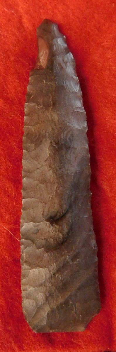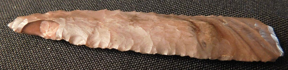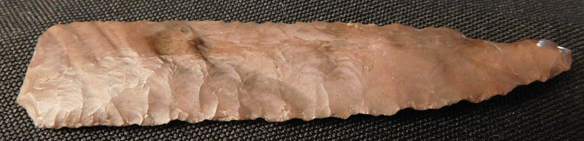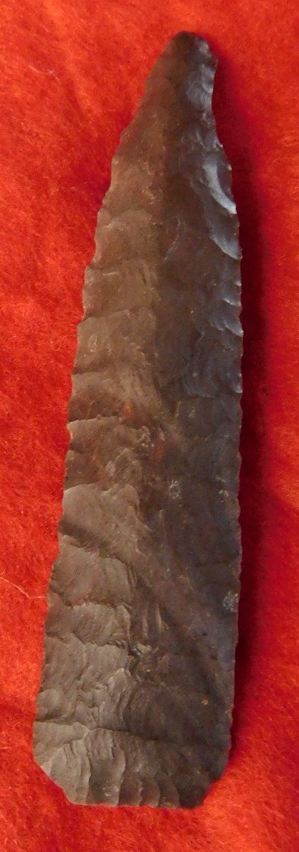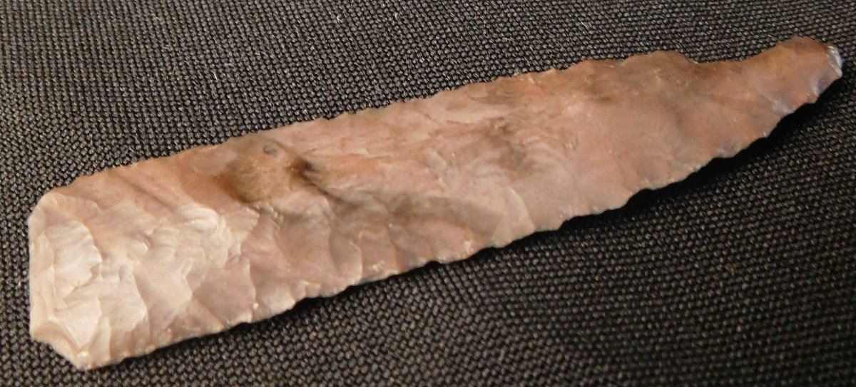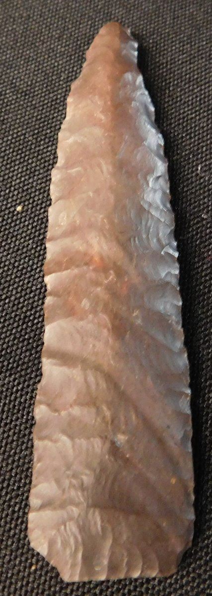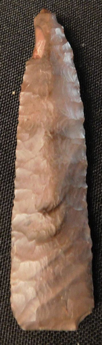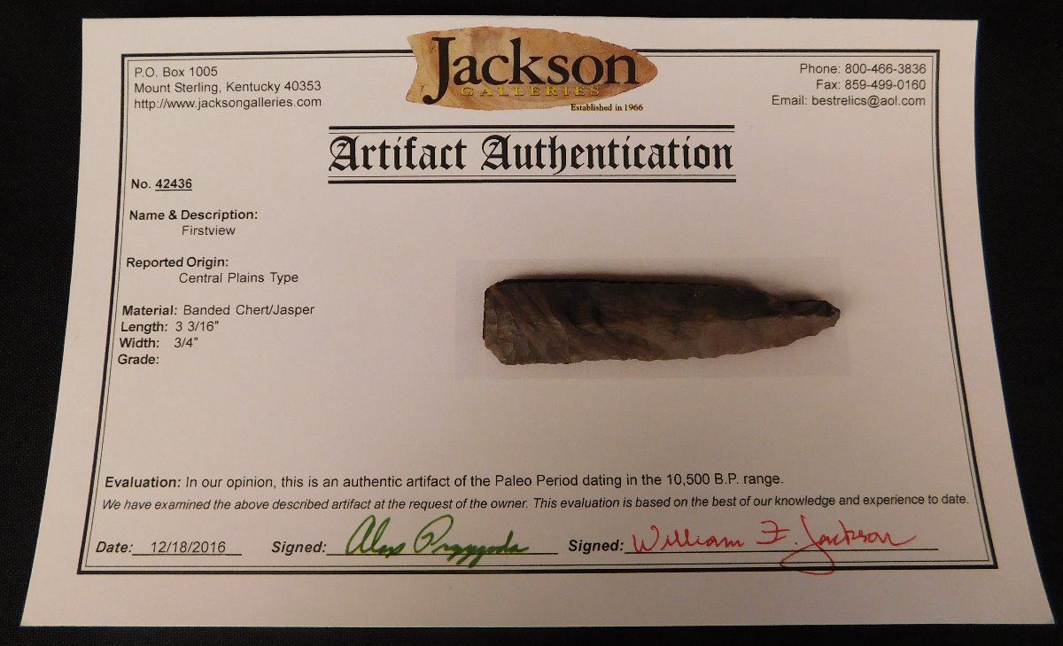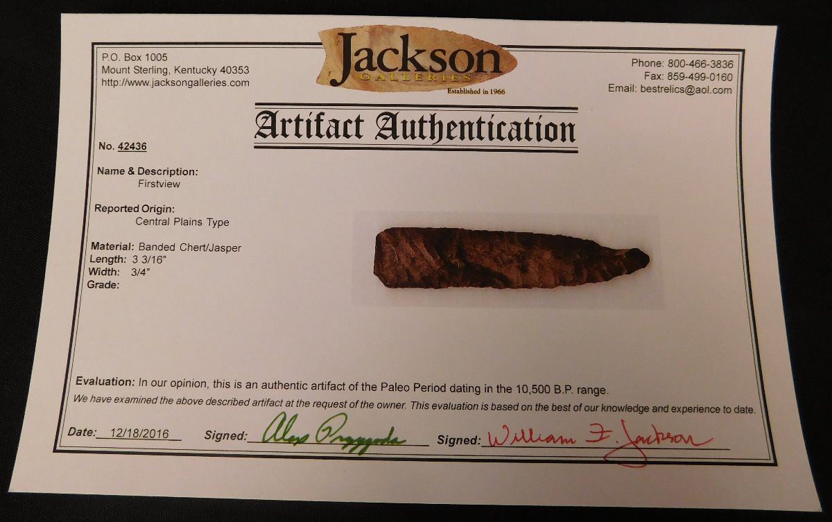 Paleo First View w/Jackson COA, circa 10,500 yrs B.P. Made of chert jasper, the item is 3 3/16" x 3/4". Central Plains. Parallel flaking. Condition: Some chips, damage, see images. Shipping: $16.50 w/insurance and signature.