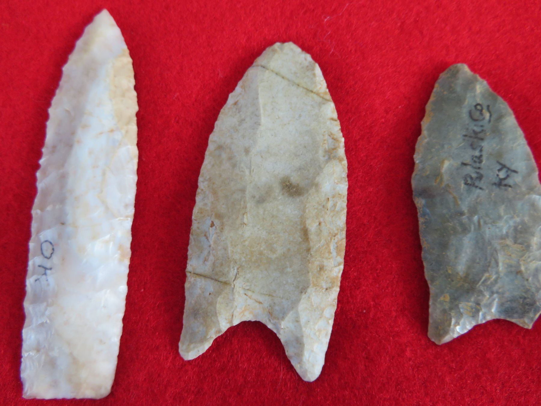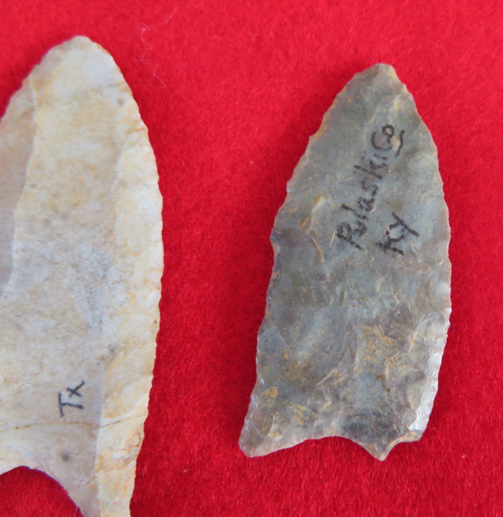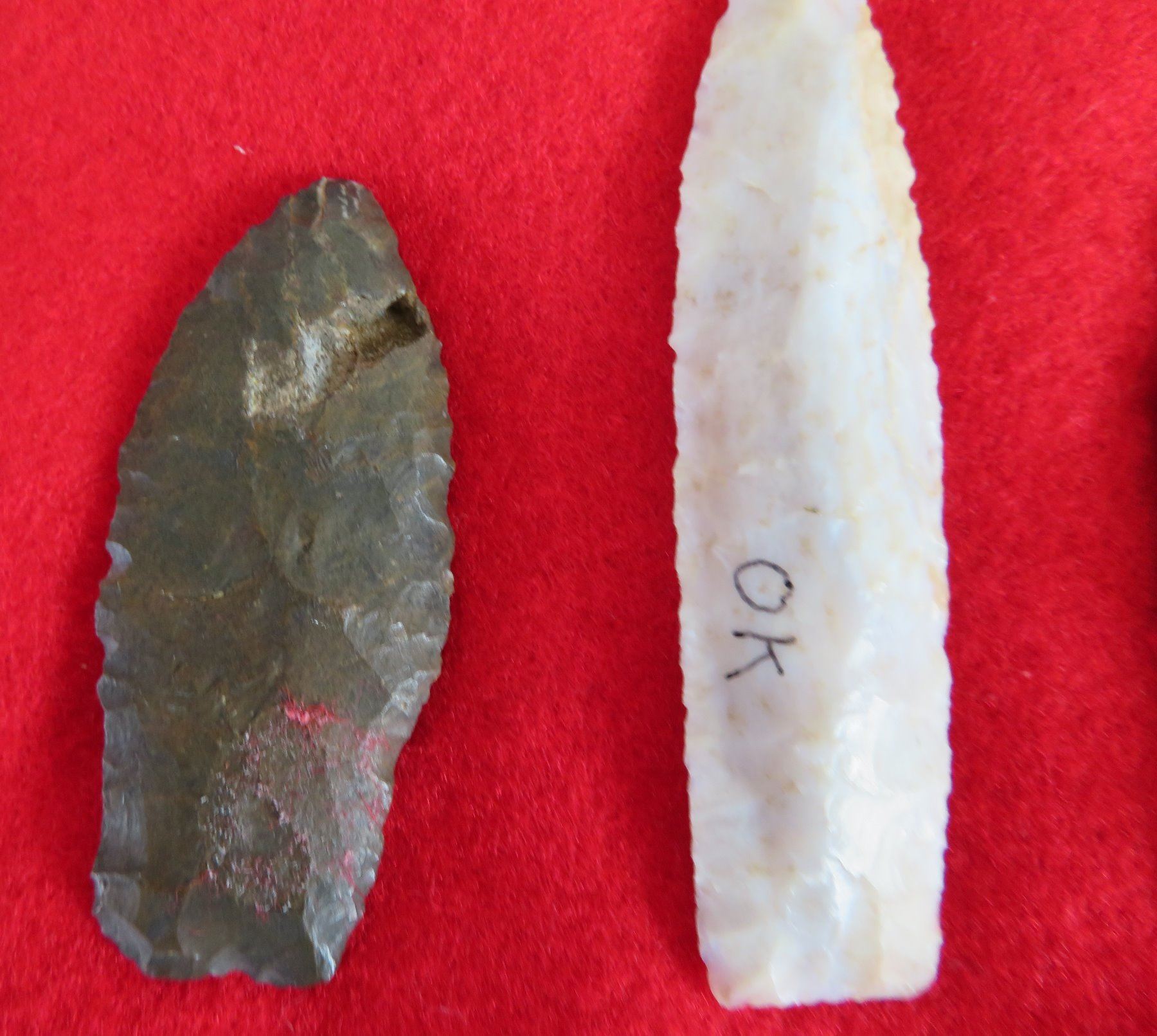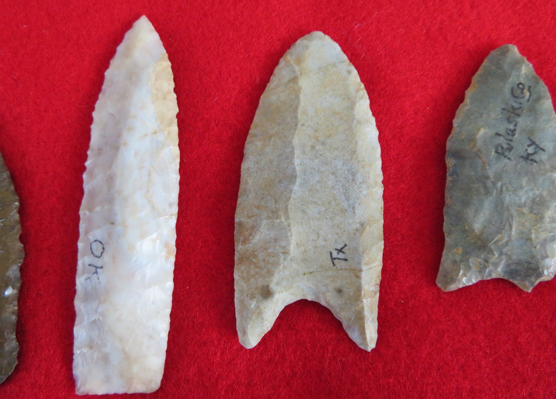Paleo Flint Collection, 7,000 to 10,000 years old. Made of flint and chert, the longest item measures 3 1/2". Oklahoma, Tennessee, Kentucky artifacts. Nice chipping and fluted point. Frame not included. Condition: Good, see images. Shipping: $24.50 w/insurance and signature.