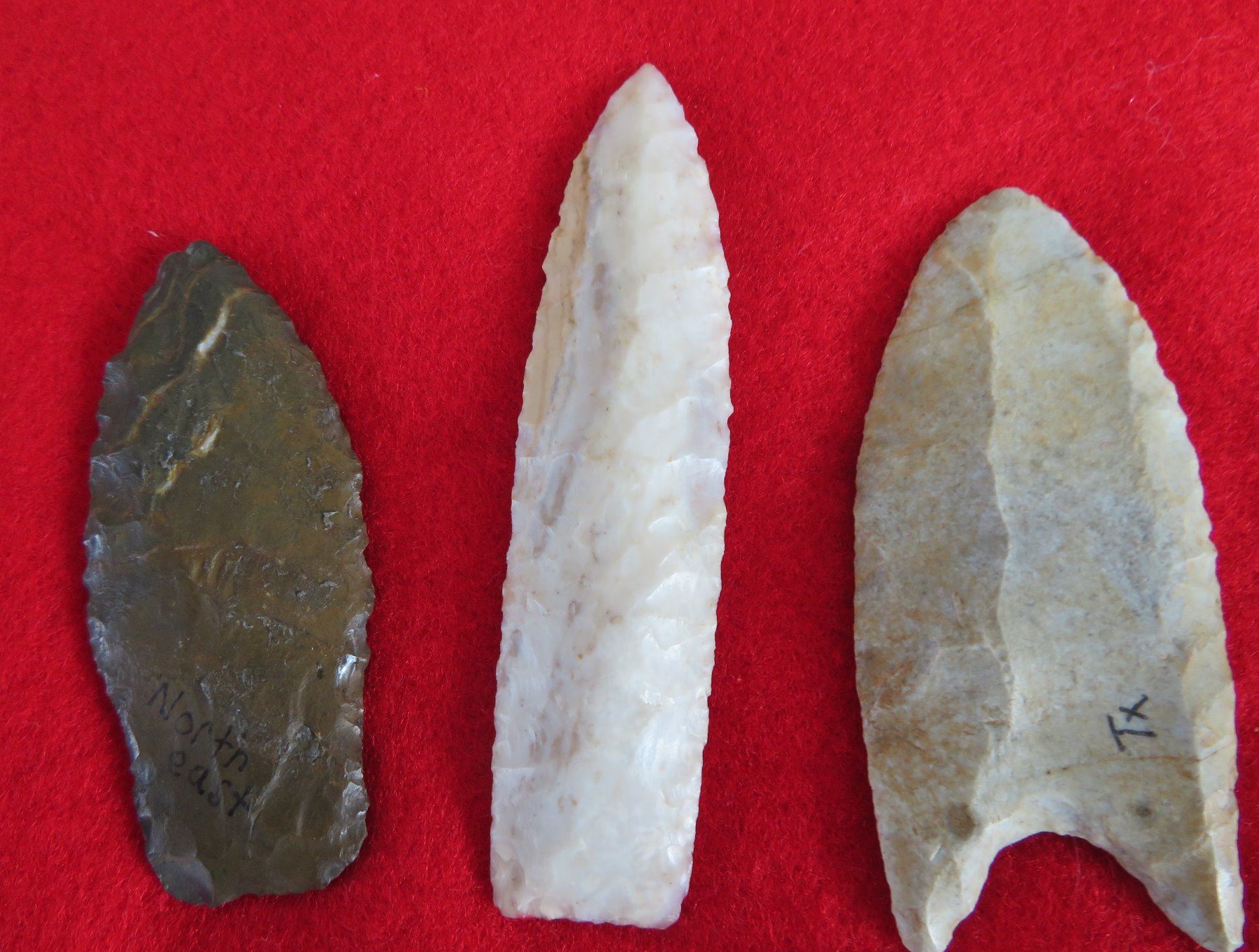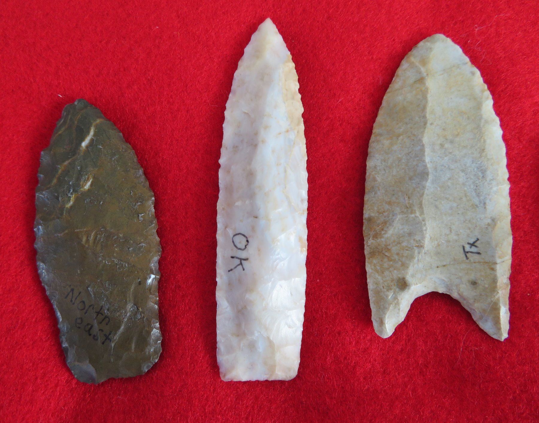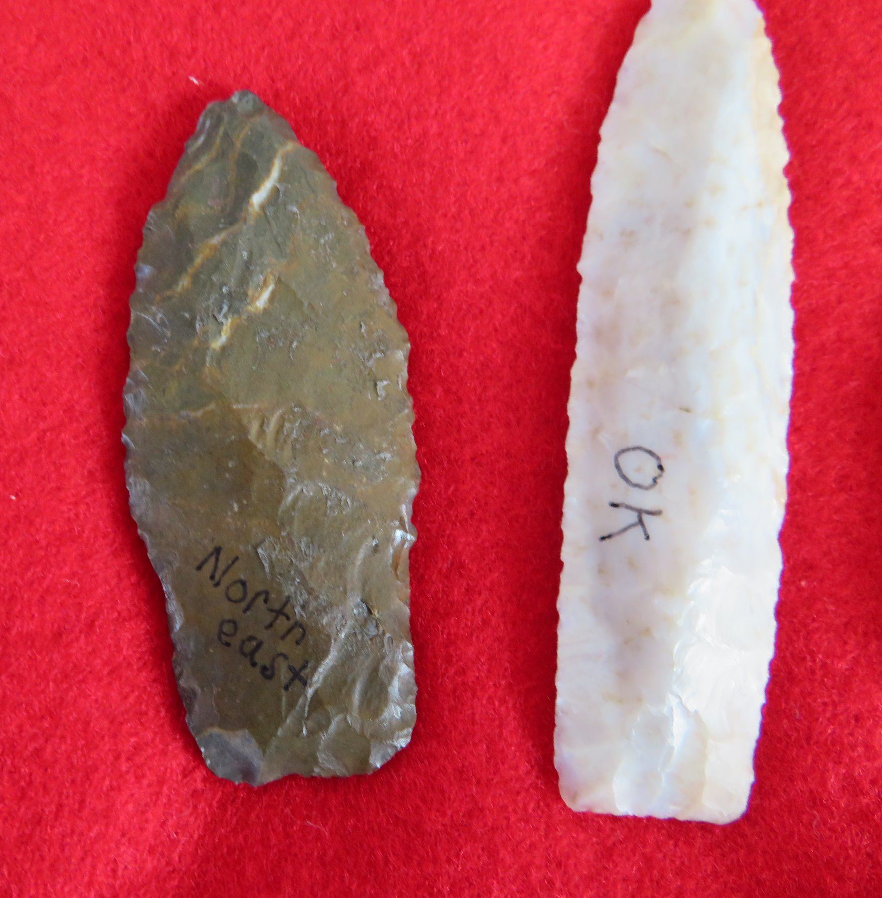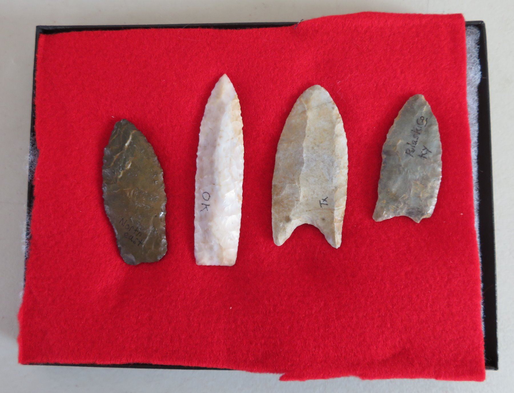 Paleo Flint Collection, 7,000 to 10,000 years old. Made of flint and chert, the longest item measures 3 1/2". Oklahoma, Tennessee, Kentucky artifacts. Nice chipping and fluted point. Frame not included. Condition: Good, see images. Shipping: $24.50 w/insurance and signature.
