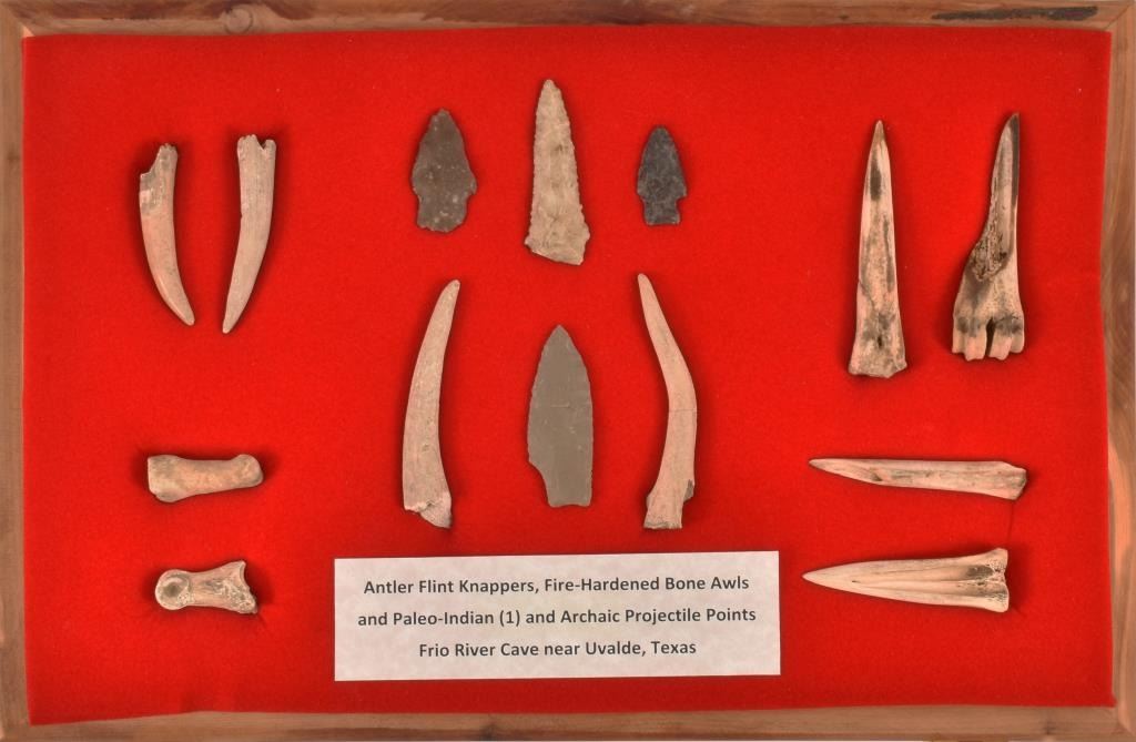 Including Antler Flint Knappers, Fire-Hardened Bone Awls & Projectile Points. From Frio River Cave near Uvalde, TX. 18" x12" x 2"