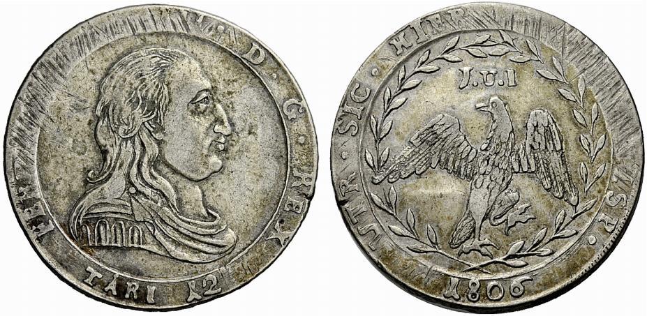 Palermo. Emissioni a nome di Ferdinando III, 1799-1810. Da 12 tarì 1806. Spahr 136. Pagani 15. Molto raro. q.BB
