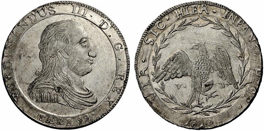 Palermo. Emissioni a nome di Ferdinando III, 1799-1810. Da 12 tarì 1810. Spahr 138. Pagani 17. Raro. Migliore di Spl