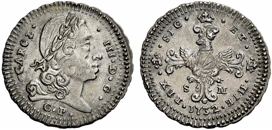 Palermo. Carlo Arciduca d’Austria, III come re di Spagna e di Sicilia, 1720-1734, VI come imperatore, 1711-1740. Emissioni del 1732–1734. Da 3 tarì 1732. AR 7,20g. CAROL – III D G Testa laureata a d.; sotto, C.P. Rv. REX – SIC – ET – HIE Aquila coronata con scudo absburgico sul petto caricata su croce ornata con bracci sormontati da corone fogliate; in basso, sigle S – M. Spahr 60 var. MIR 530/1. Spl