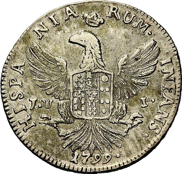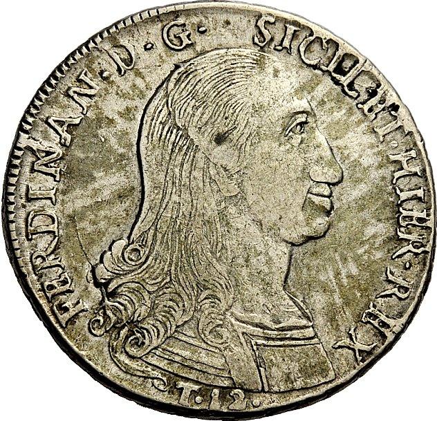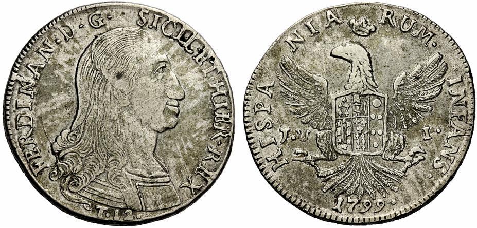 Palermo. Ferdinando III poi I di Borbone, 1759-1825. Da 12 tarì 1799. AR 27,08g. FERDINAN. D.G. – SICIL.ET. HIER.REX Busto corazzato a d.; sotto, T.12. Rv. HISPA – NIA – RVM. – INFANS. Stemma caricato su aquila coronata ad ali spiegate e volta a s.; sotto le ali, sigle, J.U. – I. Spahr 34. Pagani 2a. MIR 603/5. Buon BB / BB