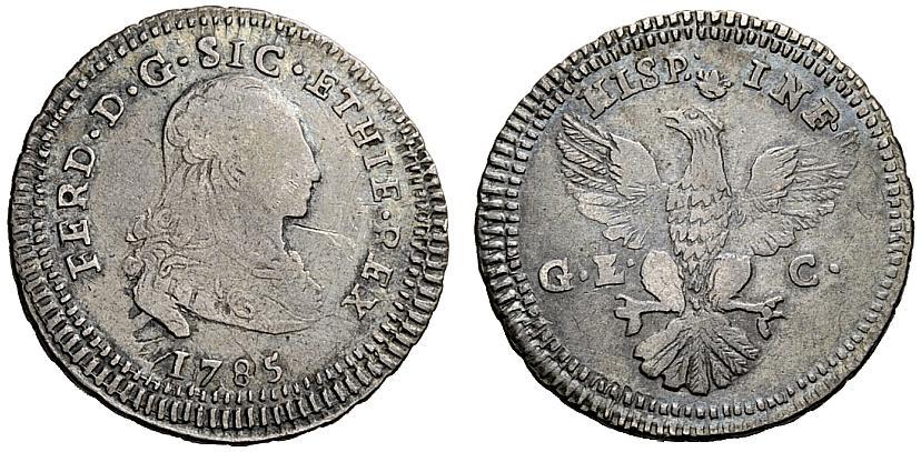 Palermo. Ferdinando III poi I di Borbone, 1759-1825. Da 2 tarì 1785. AR 4,42g. FERD.D.G.SIC.ET.HIE.REX. Busto piccolo corazzato a d. Rv. HISP. – INF. Aquila coronata ad ali spiegate e volta a s.; sotto le ali, sigle, G.L. – C. Spahr 65. MIR 619/1. Raro. MB