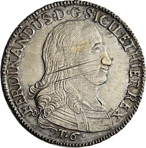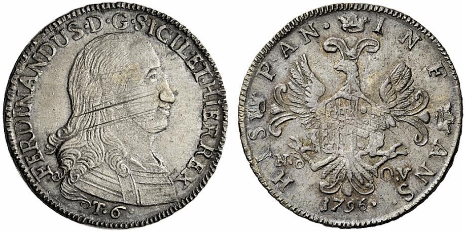Palermo. Ferdinando III poi I di Borbone, 1759-1825. Da 6 tarì 1796. AR 13,54g. FERDINANDUS.D.G.SIC.ET.HIER.REX Busto corazzato a d.; sotto, T.6. Rv. HIS – PAN. – INF – ANS. Stemma caricato su aquila coronata, ad ali spiegate, volta a sinistra; sotto gli artigli, N.d’ – O.V. Spahr 43. MIR 608/1. Graffietti, altrimenti BB