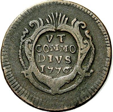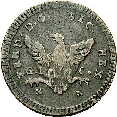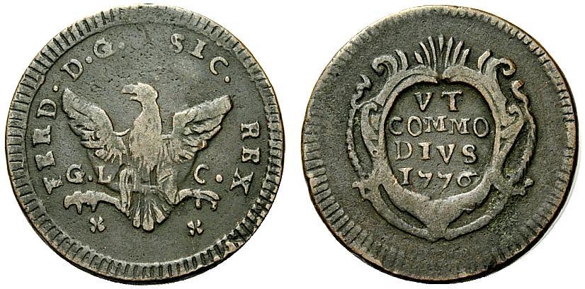 Palermo. Ferdinando III poi I di Borbone, 1759-1825. Grano 1776. Æ 4,49g. FERD.D.G. – SIC.REX Aquila coronata ad ali spiegate e volta a s.; sotto le ali, sigle, G.L. – C. Rv. VT / COMMO / DIVS / 1776 in quattro righe entro cartella ornata. Spahr 102. MIR 635/2. BB
