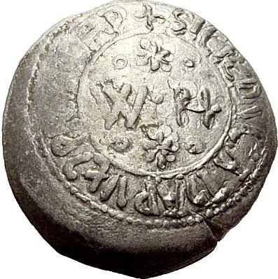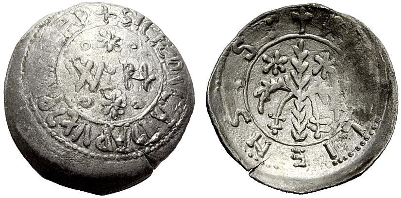 Palermo. Guglielmo II re, 1166-1189. Apuliense. AR 1,87g. à / W·RX / à entro cerchio lineare; intorno, nel giro, + SICIL DVCAT APVL 7 PRINC CAP. Rv. + APVLIENSIS: Palmizio con datteri accostato in alto da due stelle. Spahr 112. MIN 363 var. MEC 14, 396 var. MIR 439. Molto raro. Spl