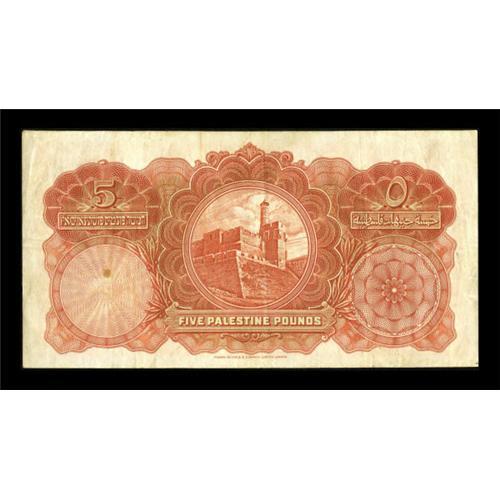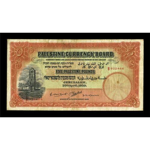 <B>Palestine </B></I>5 Pounds Palestine Currency Board 1939 Pick 8c<BR> This nice mid-grade note has original paper surfaces and wholesome edges. <B>Fine-Very Fine.</B></I><BR><BR><b>Shipping:</b> Coins & Currency (<a target="_blank" href="http://www.heritageauctions.com/common/shipping.php">view shipping information</a>)