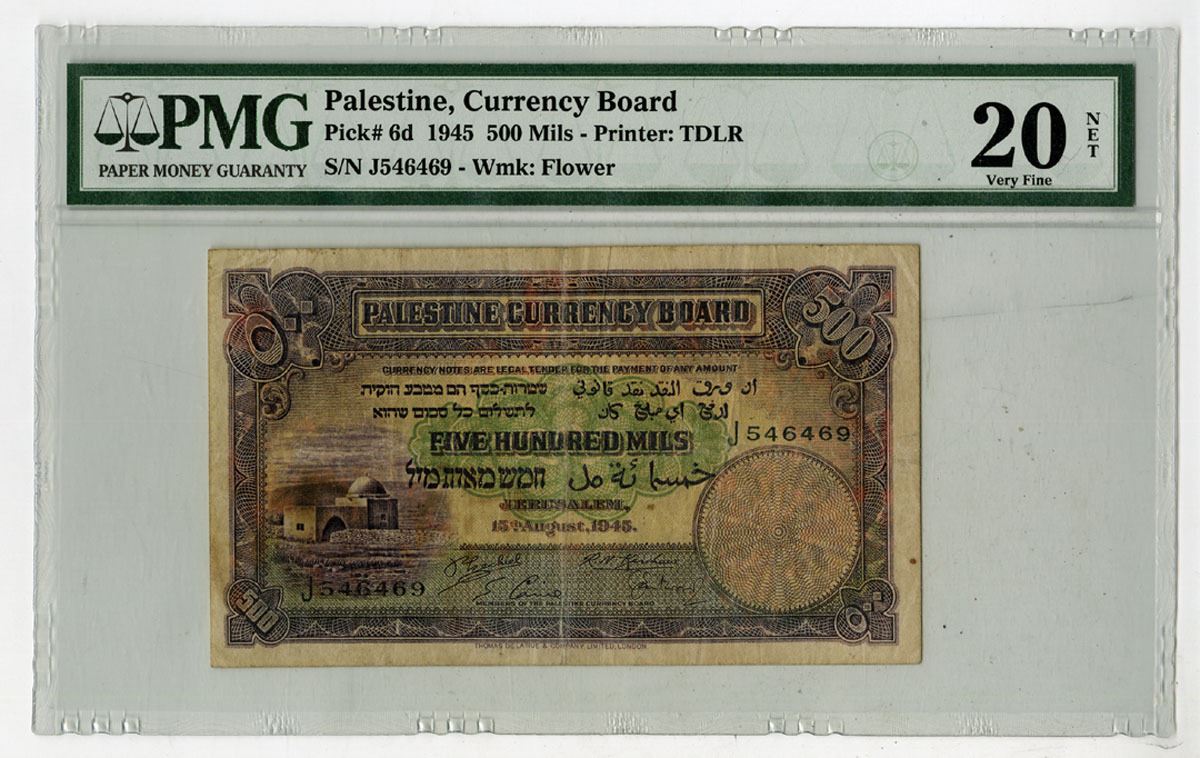 Israel (Palestine), 1945.. 500 Mils, P-6d, Issued Banknote, Purple on green underprint with Rachel's tomb near Bethlehem at left, Back is purple and brown with Tower of David at center, S/N J546469, PMG graded Very Fine 20 NET with comment "Discoloration," TDLR.