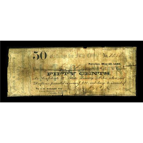 <B>Palestine, TX- John G. Gooch's Law, Collection and Exchange Office</B></I> 50¢ May 25, 1862 Medlar 11<BR>For this very rare issuer Medlar was unable to show even a picture of any denomination in his reference. This example has a long lateral split that has been repaired. <B>About Good.</B></I><BR><I>From The William A. "Bill" Bond Collection</B></I><BR><BR><b>Shipping:</b> Coin/Currency (<a target="_blank" href="http://www.heritageauctions.com/common/shipping.php">view shipping information</a>)