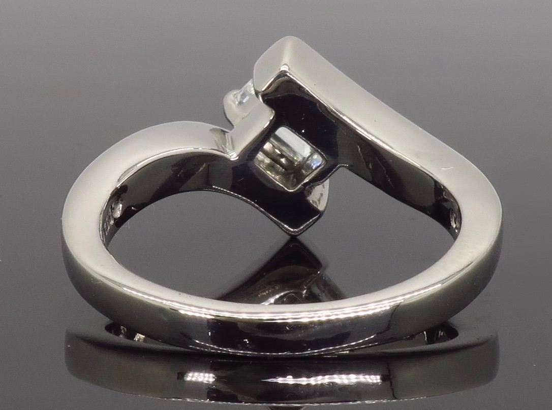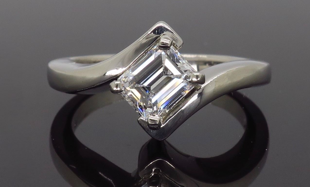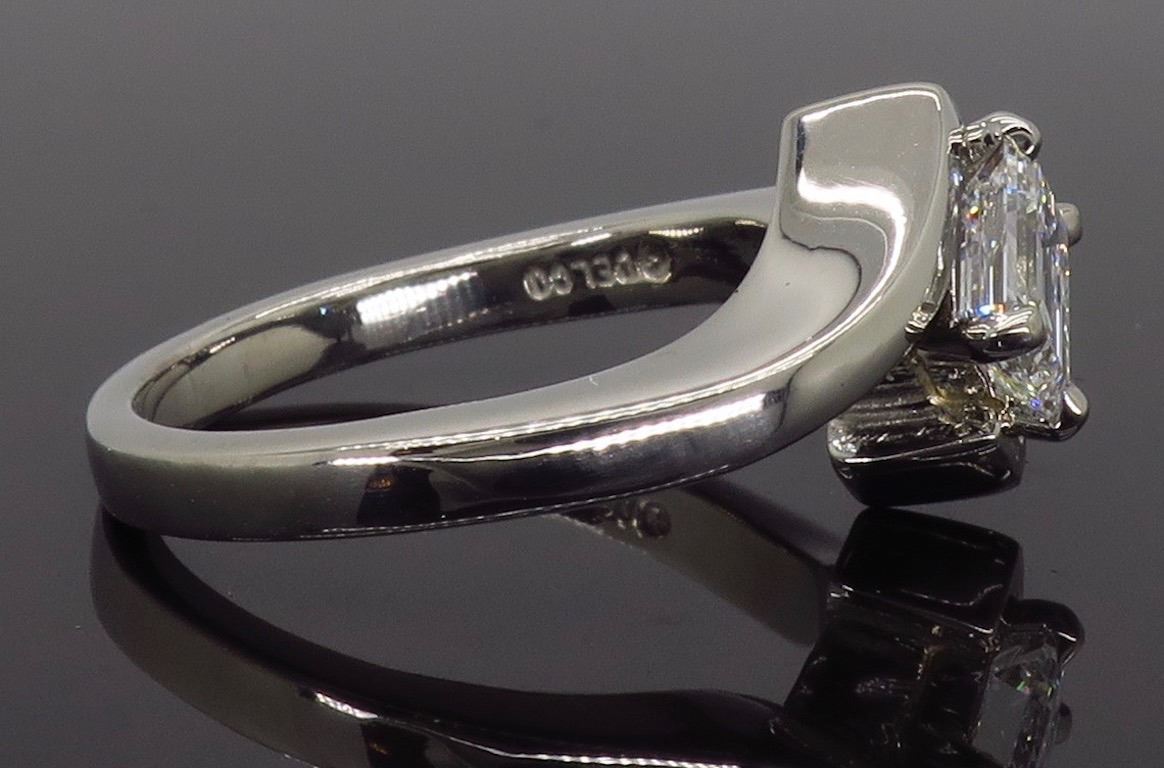 One Palladium 0.67ct Diamond Ring. (1) Emerald cut Diamond with a total weight of 0.67cts with a color of F and clarity of VS-1. Total weight of this ring is 5.6 grams. Ring is size 6.75.