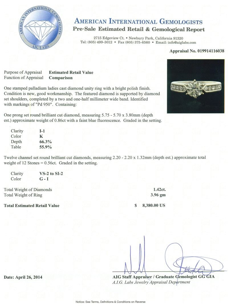 One stamped palladium ladies cast diamond unity ring with a bright polish finish. Condition is new, good workmanship. The featured diamond is supported by diamond set shoulders, completed by a two and one-half millimeter wide band. Identified with markings of "Pd 950". Containing: One prong set round brilliant cut diamond, measuring 5.75 - 5.70 x 3.80mm (depth est.) approximate weight of 0.86ct with a faint blue fluorescence. Graded in the setting. Clarity: I-1 . Color: K Depth 66.3%. Table 55.9%. Twelve channel set round brilliant cut diamonds, measuring 2.20 - 2.20 x 1.32mm (depth est.) approximate. Total Weight of 12 Stones = 0.56ct. Graded in the setting. Clarity: VS-2 to SI-2 . Color: G - I. Total Weight of Diamonds 1.42ct.. Total Weight of Ring 3.96 grams. AIG Appraised at $8,380.00.