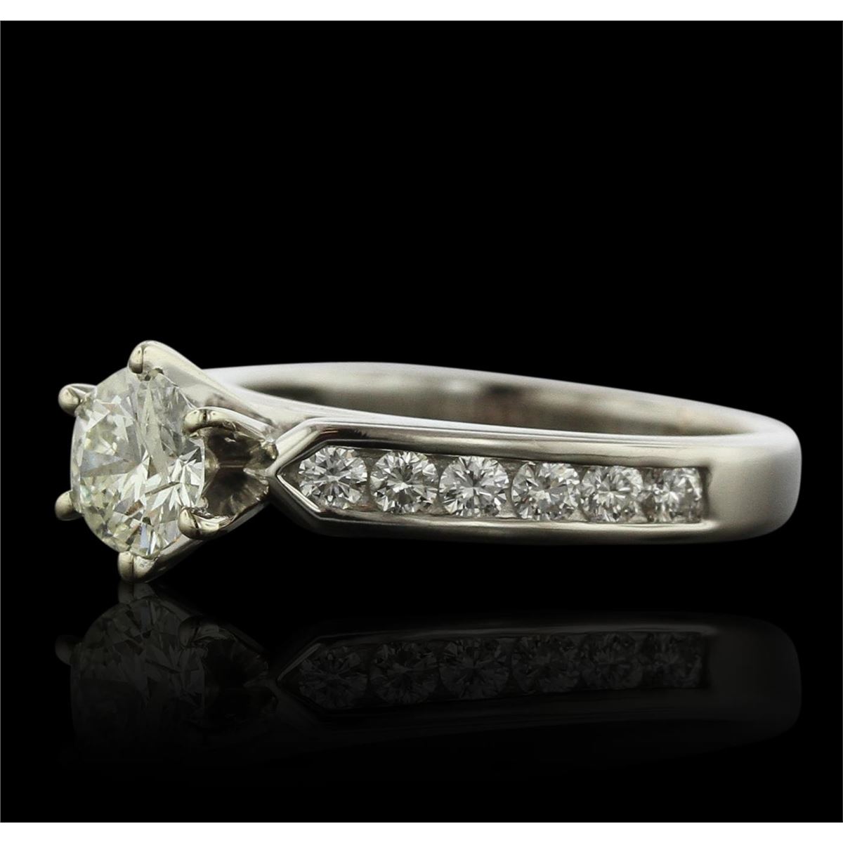 One stamped palladium ladies cast diamond unity ring with a bright polish finish. Condition is new, good workmanship. The featured diamond is supported by diamond set shoulders, completed by a two and one-half millimeter wide band. Identified with markings of "Pd 950". Containing: One prong set round brilliant cut diamond, measuring 5.75 - 5.70 x 3.80mm (depth est.) approximate weight of 0.86ct with a faint blue fluorescence. Graded in the setting. Clarity: I-1 . Color: K Depth 66.3%. Table 55.9%. Twelve channel set round brilliant cut diamonds, measuring 2.20 - 2.20 x 1.32mm (depth est.) approximate. Total Weight of 12 Stones = 0.56ct. Graded in the setting. Clarity: VS-2 to SI-2 . Color: G - I. Total Weight of Diamonds 1.42ct.. Total Weight of Ring 3.96 grams. AIG Appraised at $8,380.00.