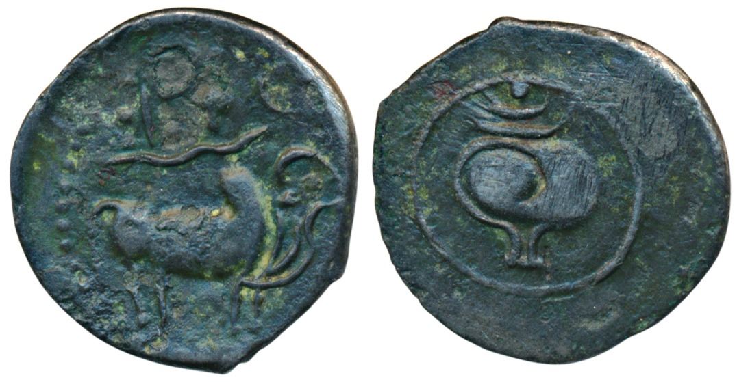 Pallavas of Kanchipuram, Potin Unit, 4.32g, early form of Vishnukundin type, obv. humped bull in standing right, rev. conch shell (shankh) within a circle. Very Fine+, Rare.