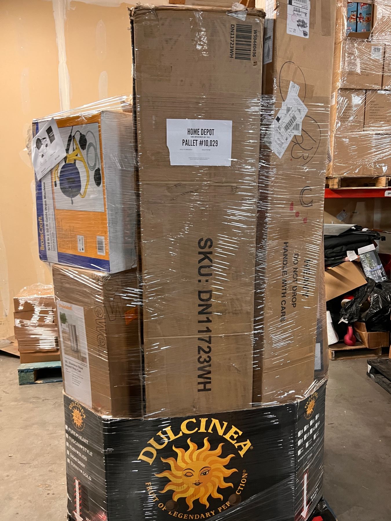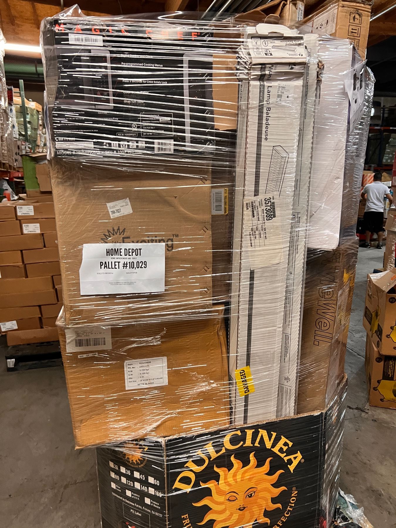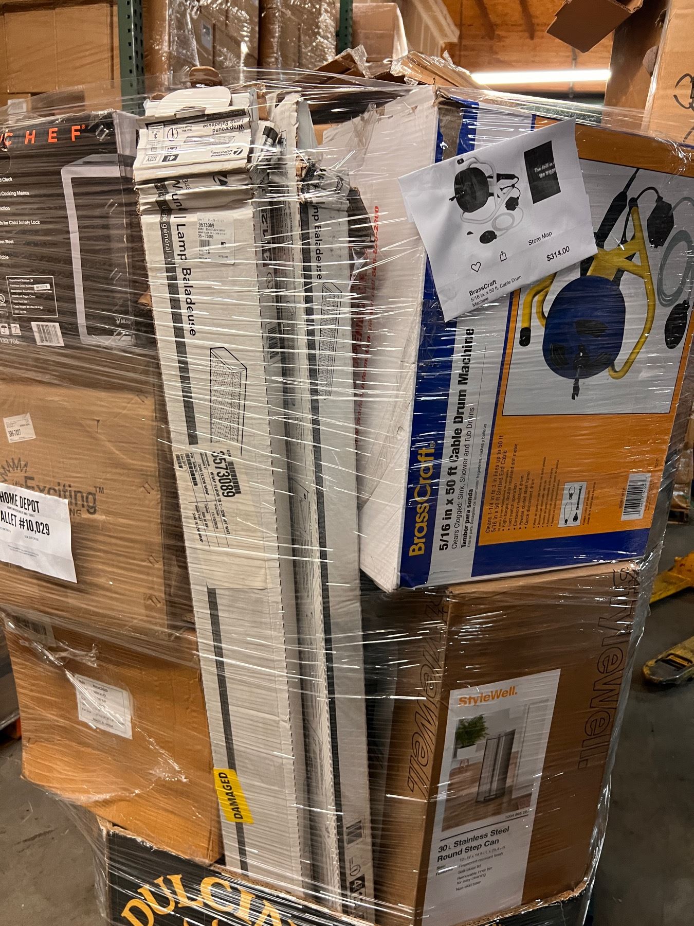 Pallet con Mercancia de Home Depot, retornos, liquidaciones y sobrecargos.