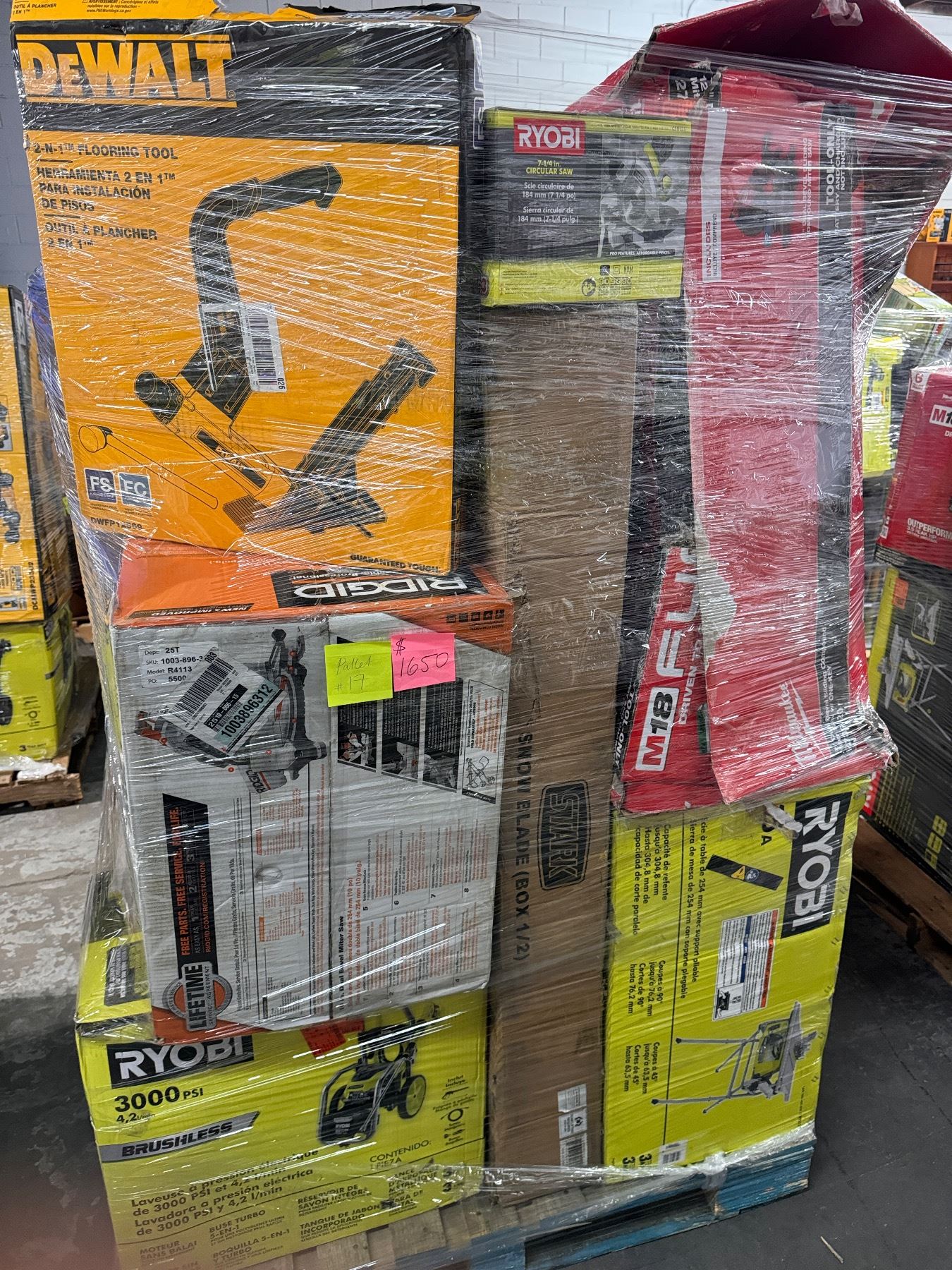 Pallet de Herramienta Home Depot, cada uno de los productos están clasificados como retornos y liquidaciones los cuales pueden venir usados, rotos y incluso completamente nuevos, apueste con responsabilidad y a lo que usted mire.