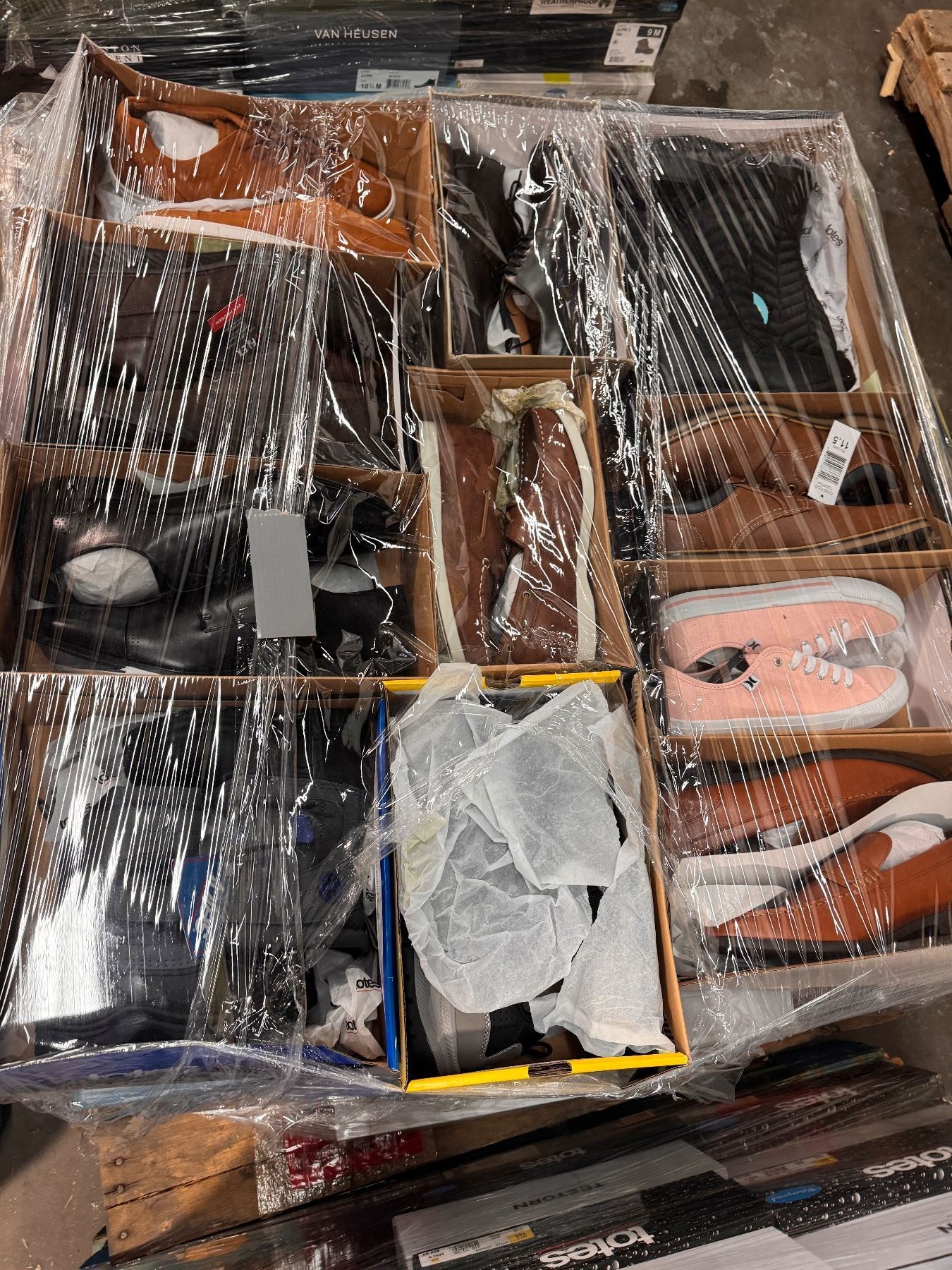 50 pares de calzado, diferentes modelos y tamaños. Cada uno de los pares es completamente nuevo. clasificados como liquidaciones y sobrecargo.