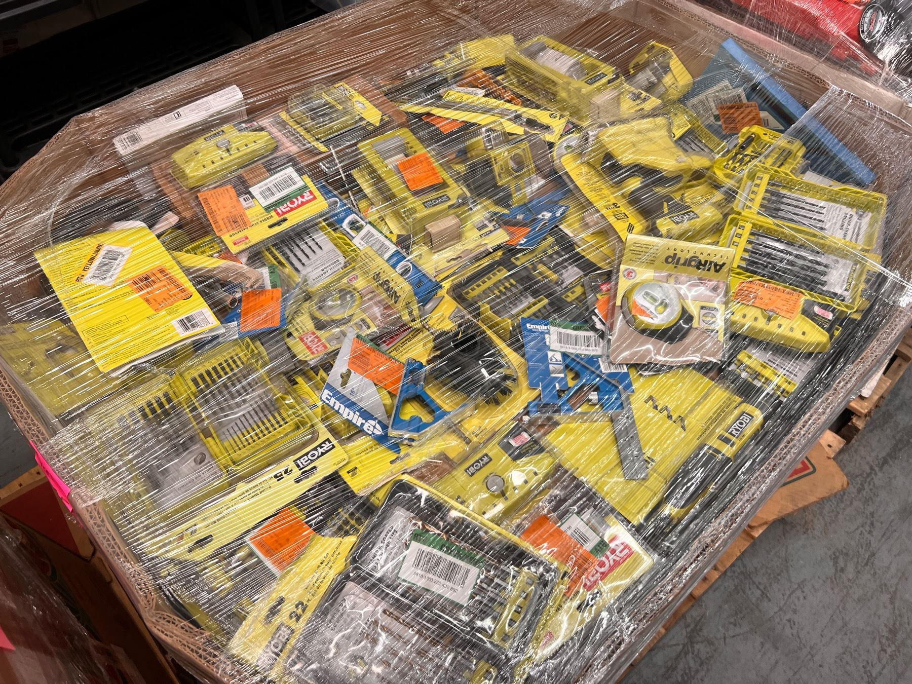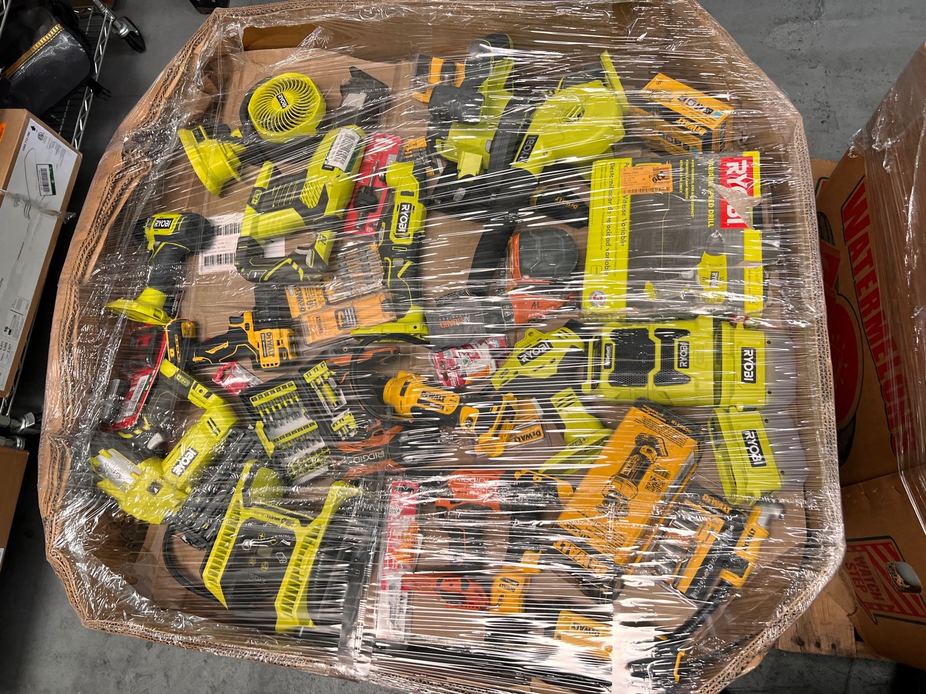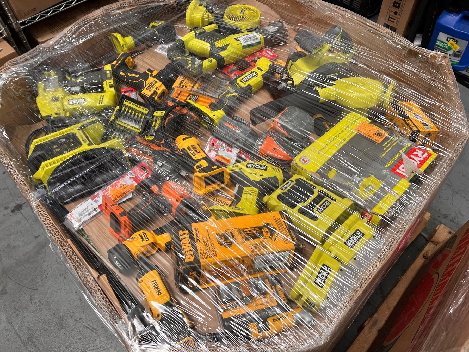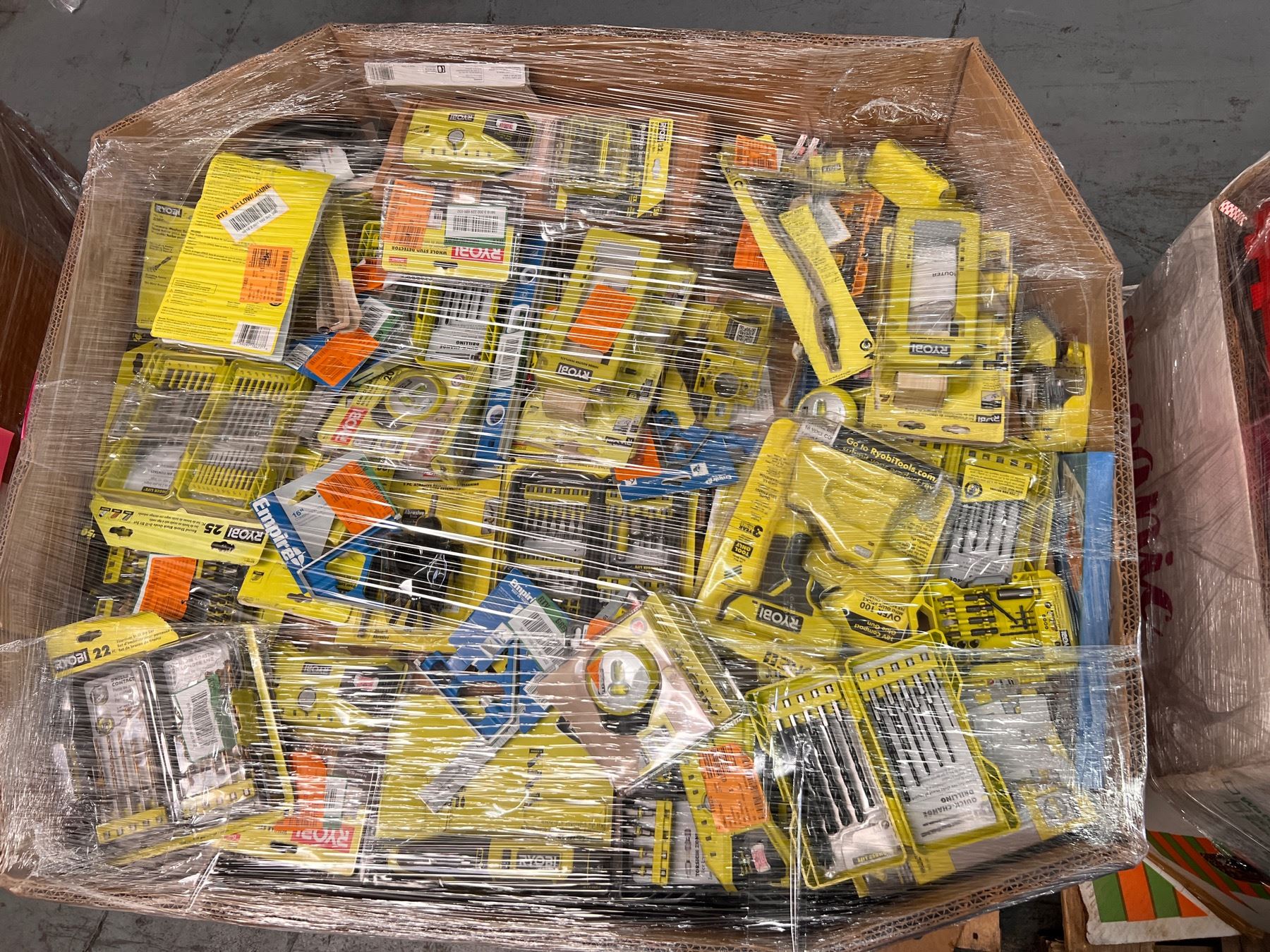Pallet con Herramienta de Home Depot, ASI COMO marcas de Ryobi. Tambien viene con mercancia de Walgreens y CVS