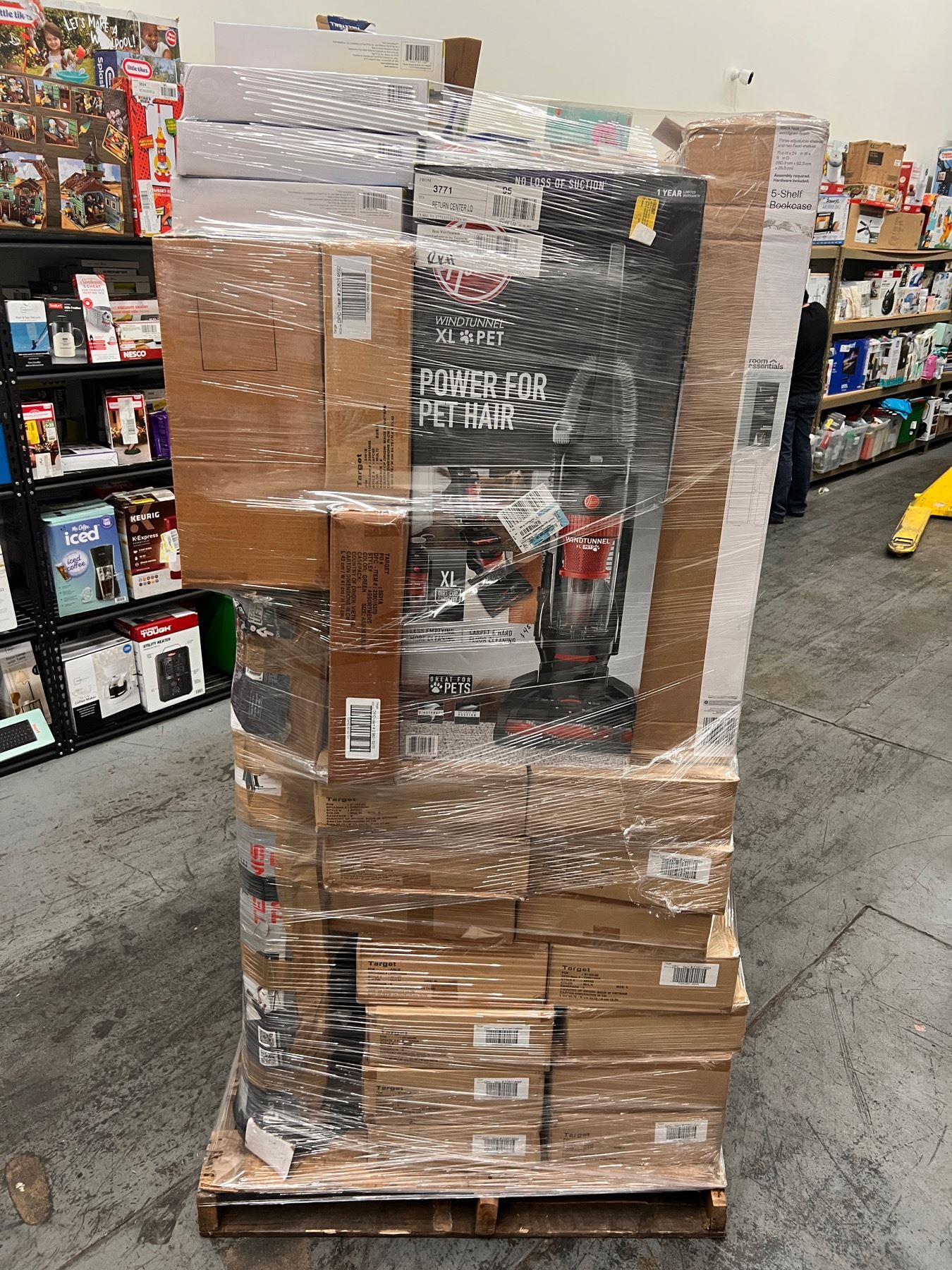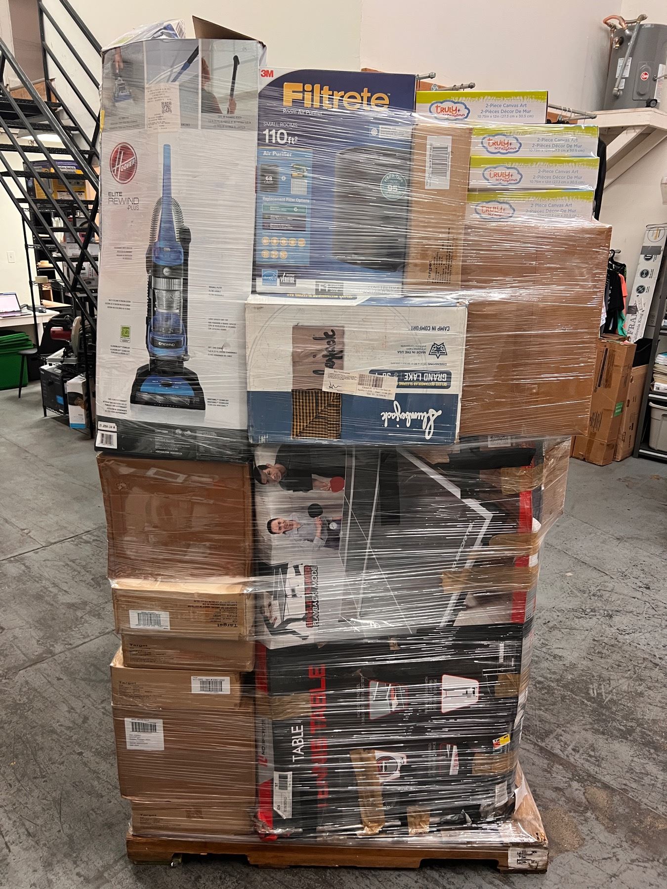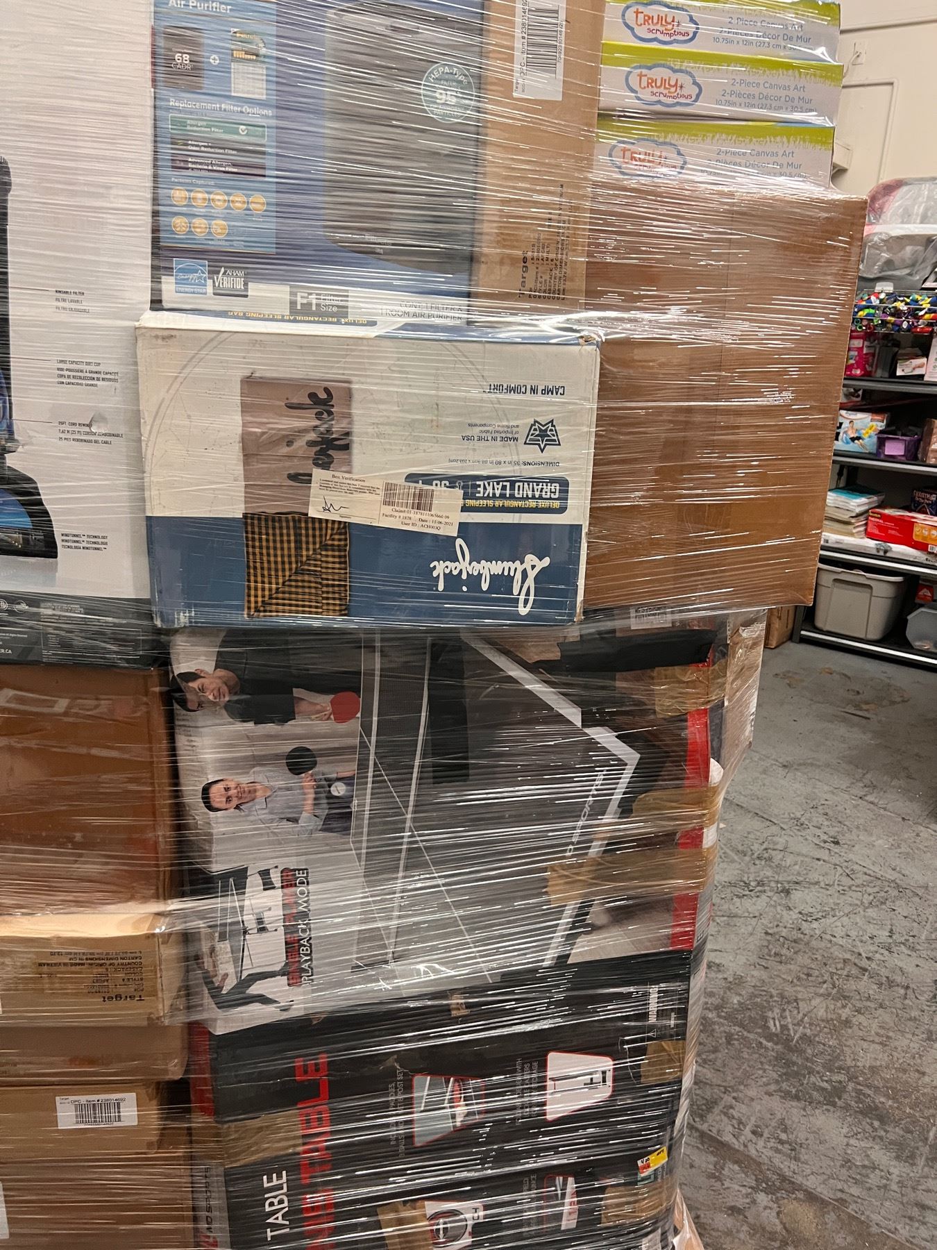 It comes with boxes of Target apparel, Walmart electronics, Home Goods ,Camping equipment, a ping pong table, vacuums and much more.