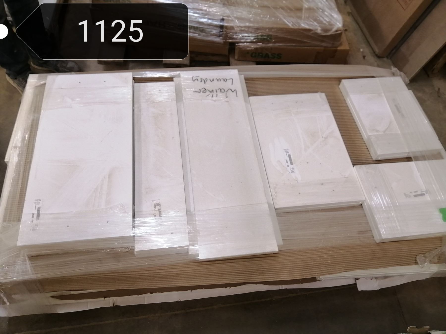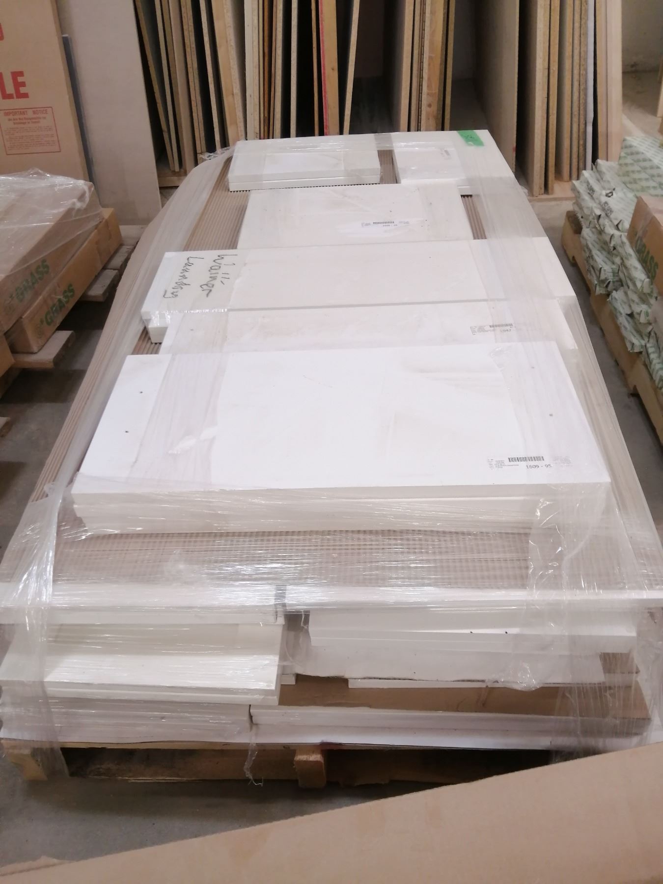 Pallet #4. Pallet of new doors all same design & colour for large kitchen, were mounted but replaced during instal.
