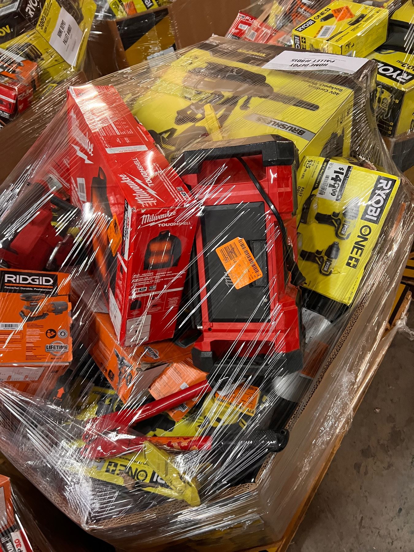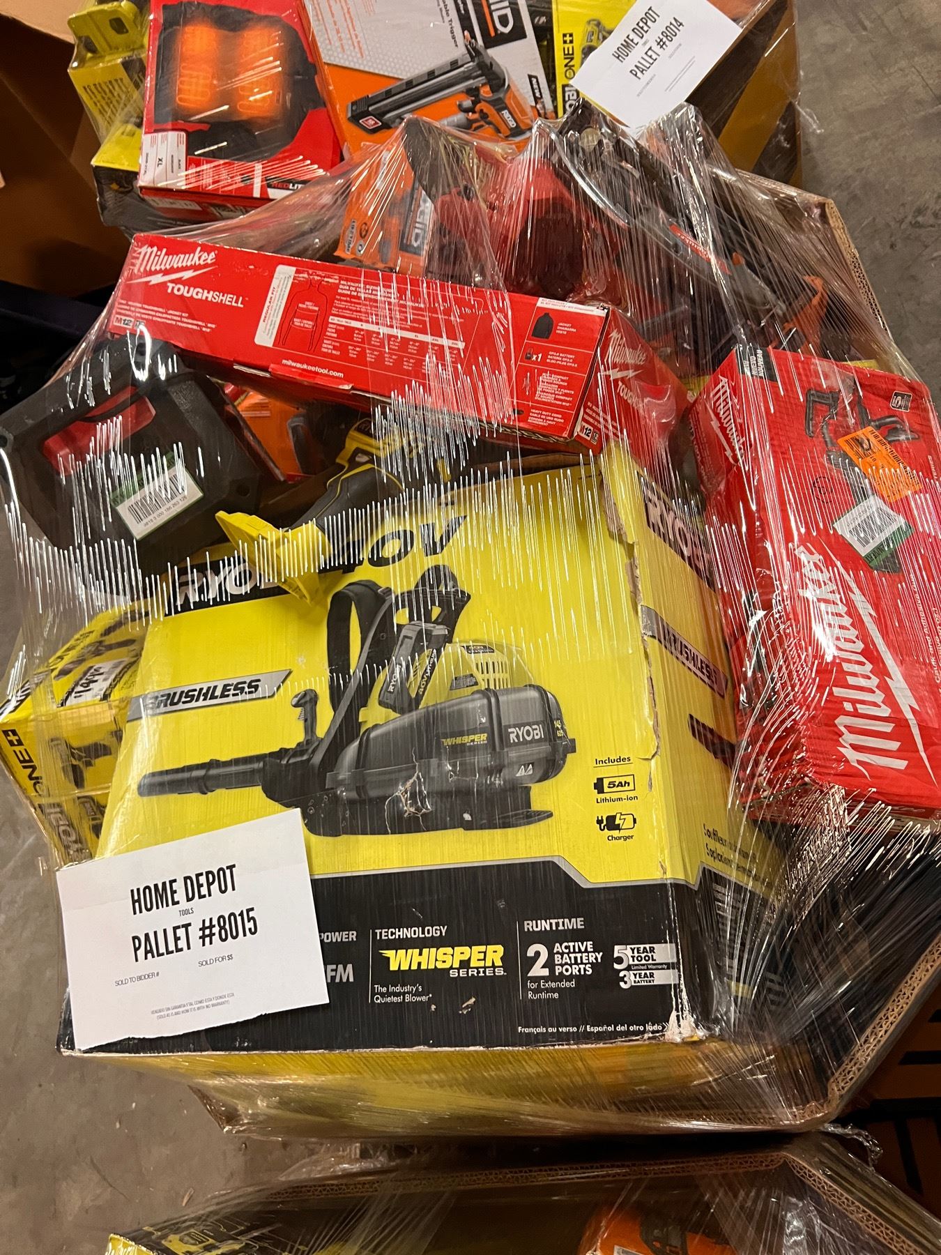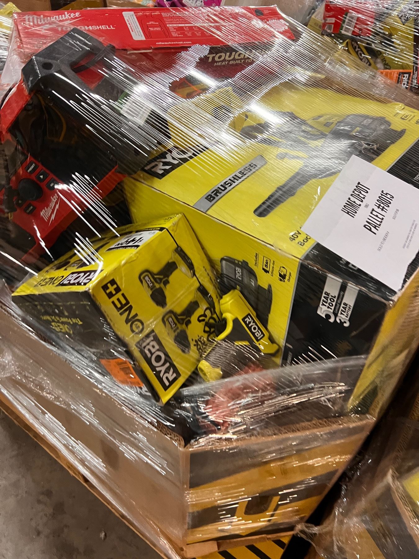 Pallet con Mercancia de Home Depot, la cual incluye Herramientas y Home Improvements. Toda la mercancia es clasificada como retornos y liquidaciones. Usted es responsable de venir por su mercancia al lugar donde la subasta se llevaba acabo o de los gastos de su traslado mediante envío el cual usted también es responsable de elegir la compañía de envíos.