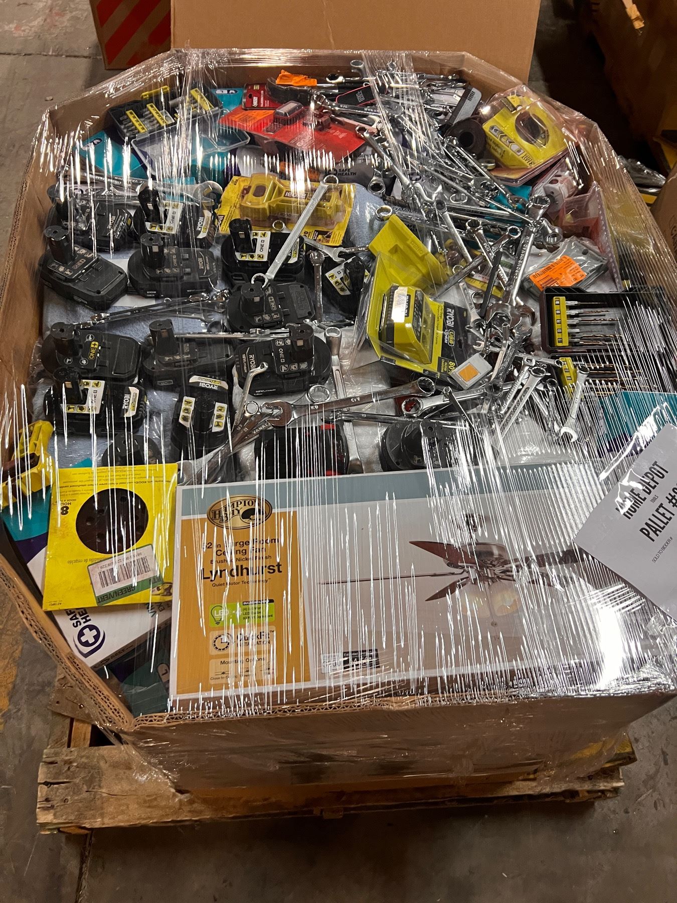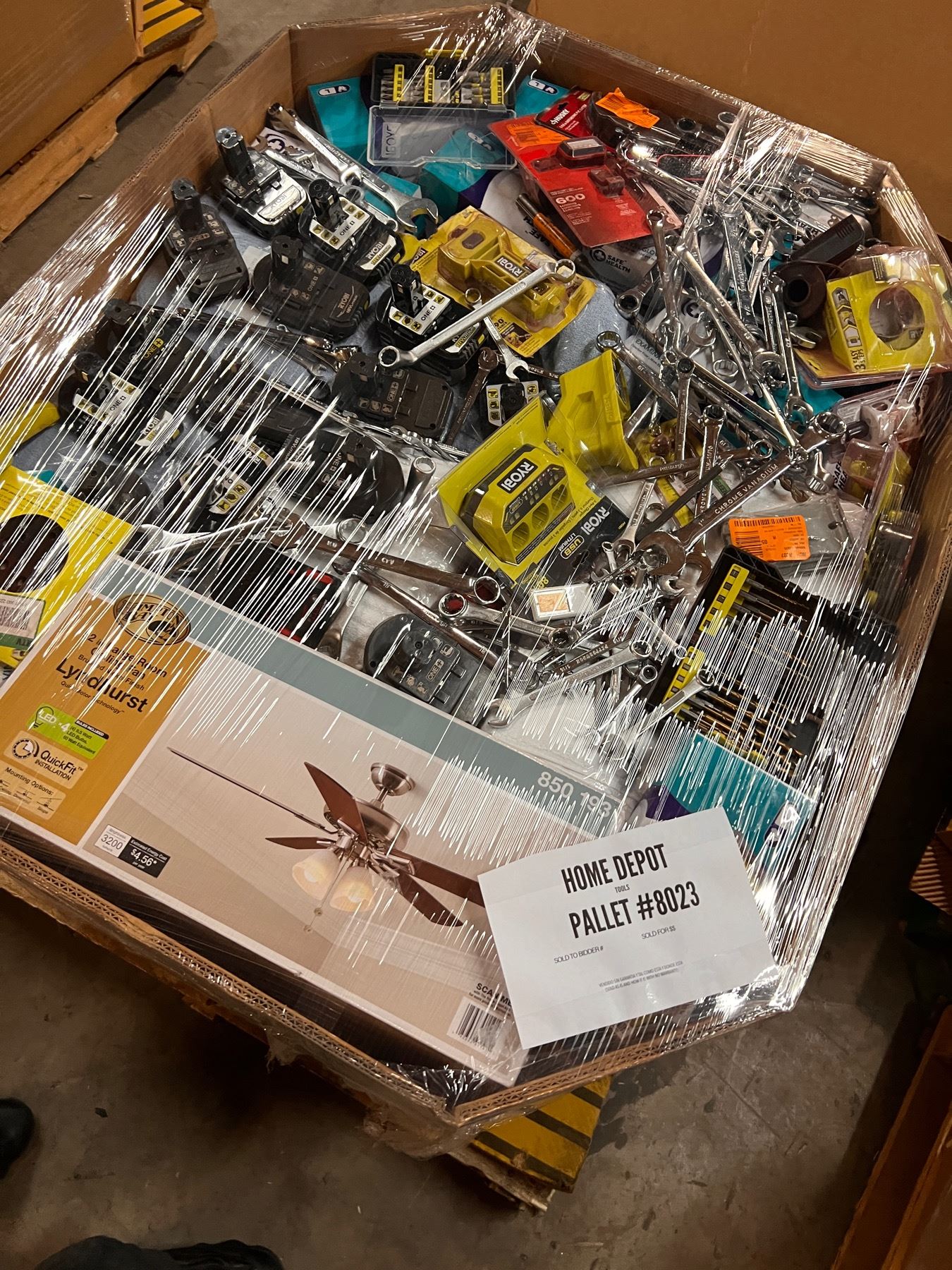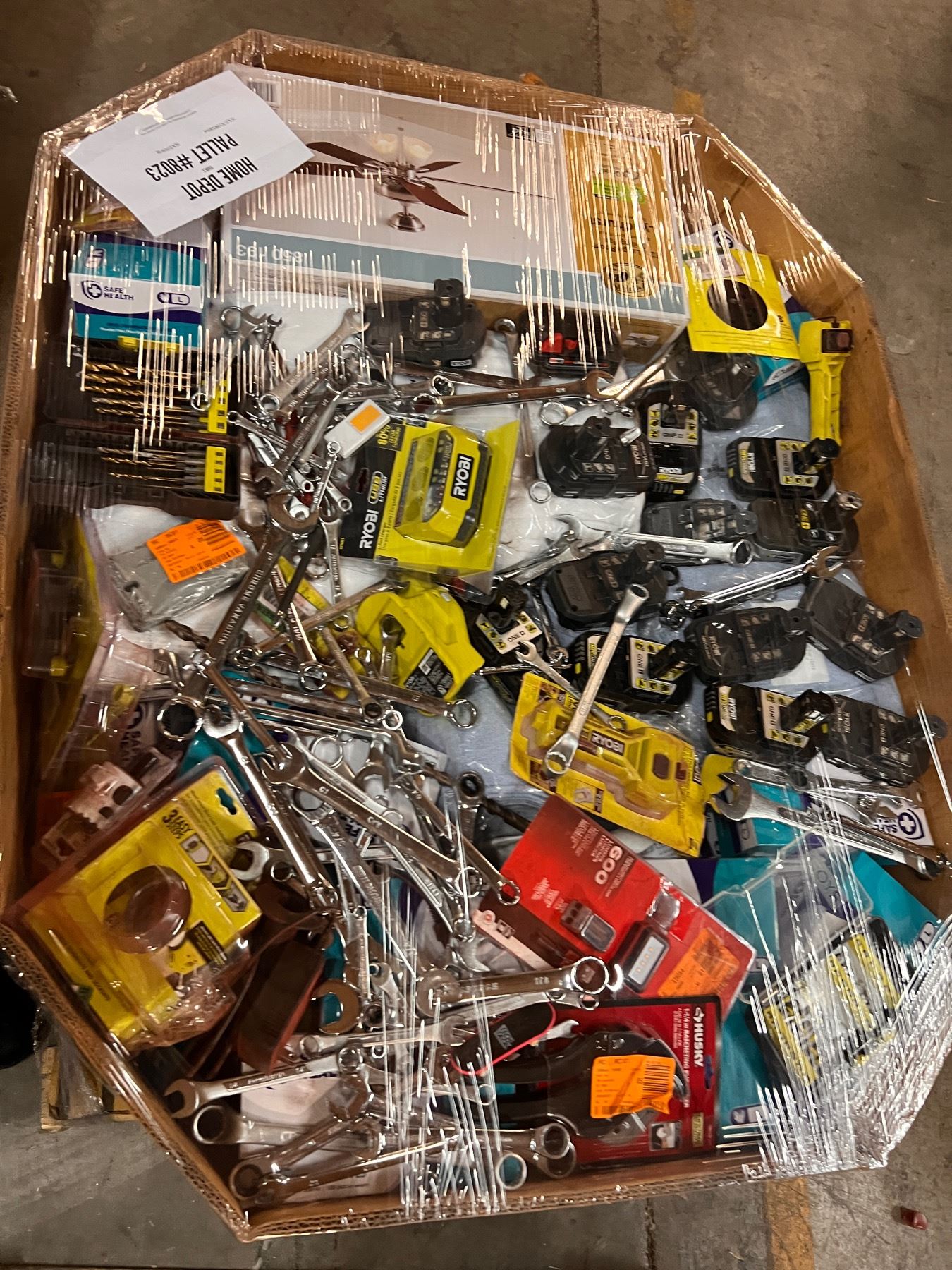 Pallet con Mercancia de Home Depot, la cual incluye Herramientas y Home Improvements. Toda la mercancia es clasificada como retornos y liquidaciones. Usted es responsable de venir por su mercancia al lugar donde la subasta se llevaba acabo o de los gastos de su traslado mediante envío el cual usted también es responsable de elegir la compañía de envíos.